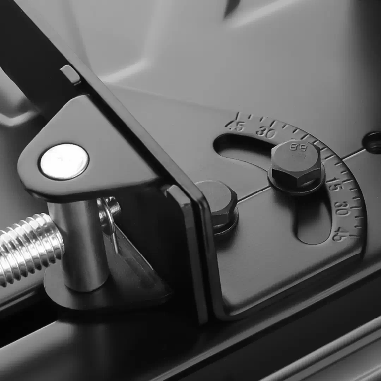 گونیای قابل تنظیم پروفیلبر مدل 5906 رونیکس، امکان برش در زوایای مختلف را با دقت بالا فراهم میکند. این گونیا تا زاویه ۴۵ درجه قابل تنظیم است و کاربر میتواند دو موقعیت متفاوت را برای برش انتخاب کند. قابلیت تنظیم زاویه، این دستگاه را برای برشهای مورب و کاریهای دقیقتر بسیار کاربردی میسازد. ساختار مقاوم گونیا در کنار سیستم قفل، موجب ثبات قطعه کار حین برش میشود.