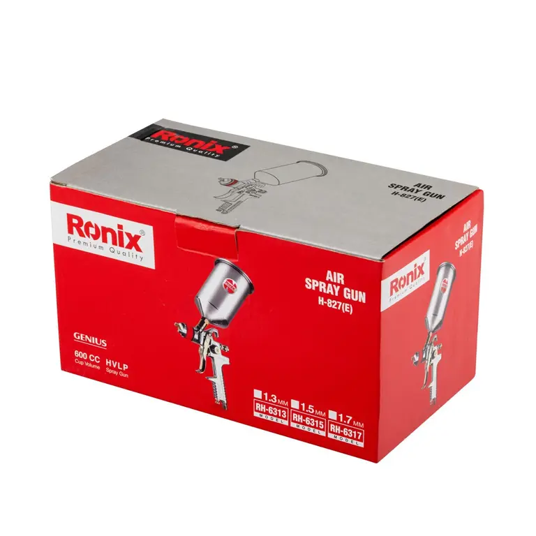 پیستوله های بادی رونیکس دارای سه ناز ل در اندازههای 1.3 و 1.5 و 1.7 هستند و در کنار تمام ویژگیها از مخزنی با ظرفیت 600 میلی لیتر برخوردارند. این مخزن به گونهای طراحی شده که باعث میشود تمام محتویات داخل آن خالی شود و در نتیجه فرایند تمیزکاری این قطعه تسهیل شود.