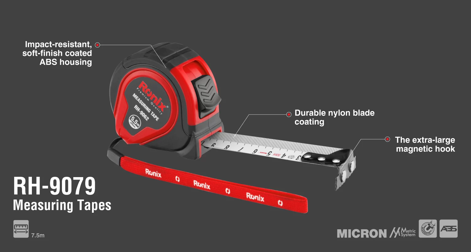 مترهای دستی رونیکس در مدلها و طولهای مختلف، متناسب با نیازهای مشتریان تولید و روانه بازار ابزار ایران و جهان میشوند. متر 7.5 متری روکشدار MICRON رونیکس مدل RH-9079، انتخابی ایدهآل برای مصارف طولانیمدت است.
