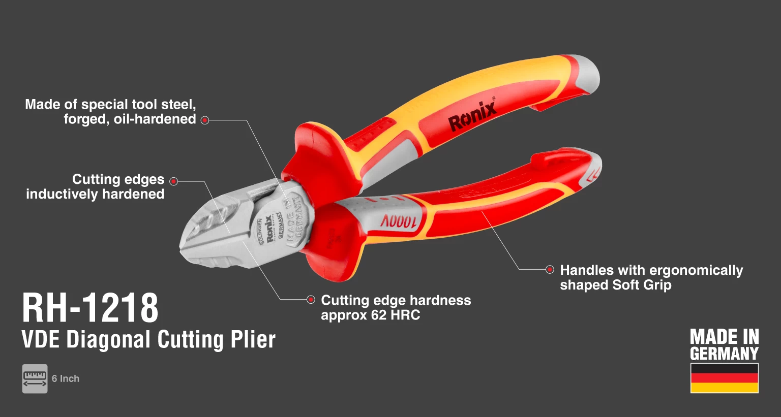 سیمچین فشار قوی 6 اینچ آلمانی رونیکس مدل RH-1218، انتخابی بینظیر برای ایجاد برشهای دقیق و قدرتمند در سیم و کابل است. این سیم چین 160 میلیمتری (6 و ¼ اینچی) با وزن 225 گرم، یک ابزار حرفهای و کارآمد است که برای برش سیمهای نرم و سخت طراحی شده است. این سیم چین فشار قوی مدل RH-1218 دارای تاییدیه VDE است. این محصول، ابزار قدرتمندی است که با لبههای بزرگتر و استحکام بیشتر، برای برش سیمهای ضخیم مورد استفاده قرار میگیرد. این سیمچین فشارقوی آلمانی با تاییدیه کامل VDE/EN 60900 برای کار ایمن در محیطهای برقدار تا 1000 ولت AC و 1500 ولت DC تولید شده است. لبههای برش دقیق این محصول، با سختی 61 تا 63 HRC، تضمینکننده برشی تمیز و دقیق، حتی برای سیمهای بسیار نازک هستند. طراحی بهینه انتقال نیرو با اهرمسازی مناسب، کار با این سیم چین آلمانی را آسان و بدون زحمت میکند. دستههای ارگونومیک با روکش چندجزئی نرم، راحتی بینظیری را برای کاربر فراهم میآورند. این ابزار با کیفیت آلمانی، از فولاد ابزار ویژه فورجشده و سختکاری شده با روغن ساخته شده و دارای استاندارد DIN ISO 5749 است که دوام و استحکام آن را تضمین میکند. در بخش شرح جزئیات محصول، بیشتر با سیم چین فشار قوی 6 اینچ آلمانی رونیکس مدل RH-1218 آشنا شوید.