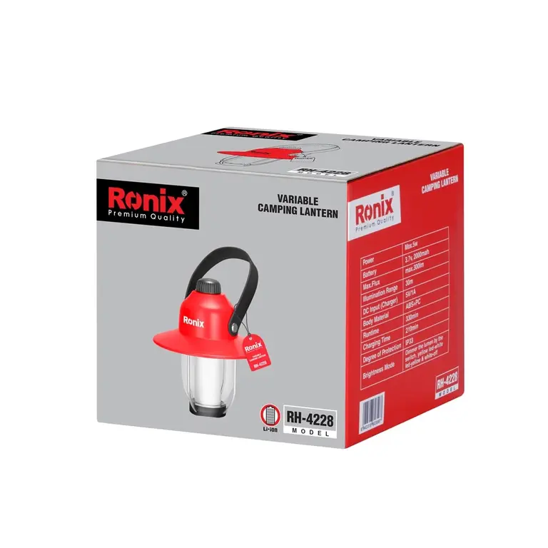 چراغ فانوسی رونیکس با شار روشنایی 300 لومن تولید میشود. باتری 3,7 ولتی این چراغ قابلیت کارکرد تا 330 دقیقه را دارد. در ادامه به بررسی ویژگیهای چراغ فانوسی رونیکس مدل RH-4228 میپردازیم.