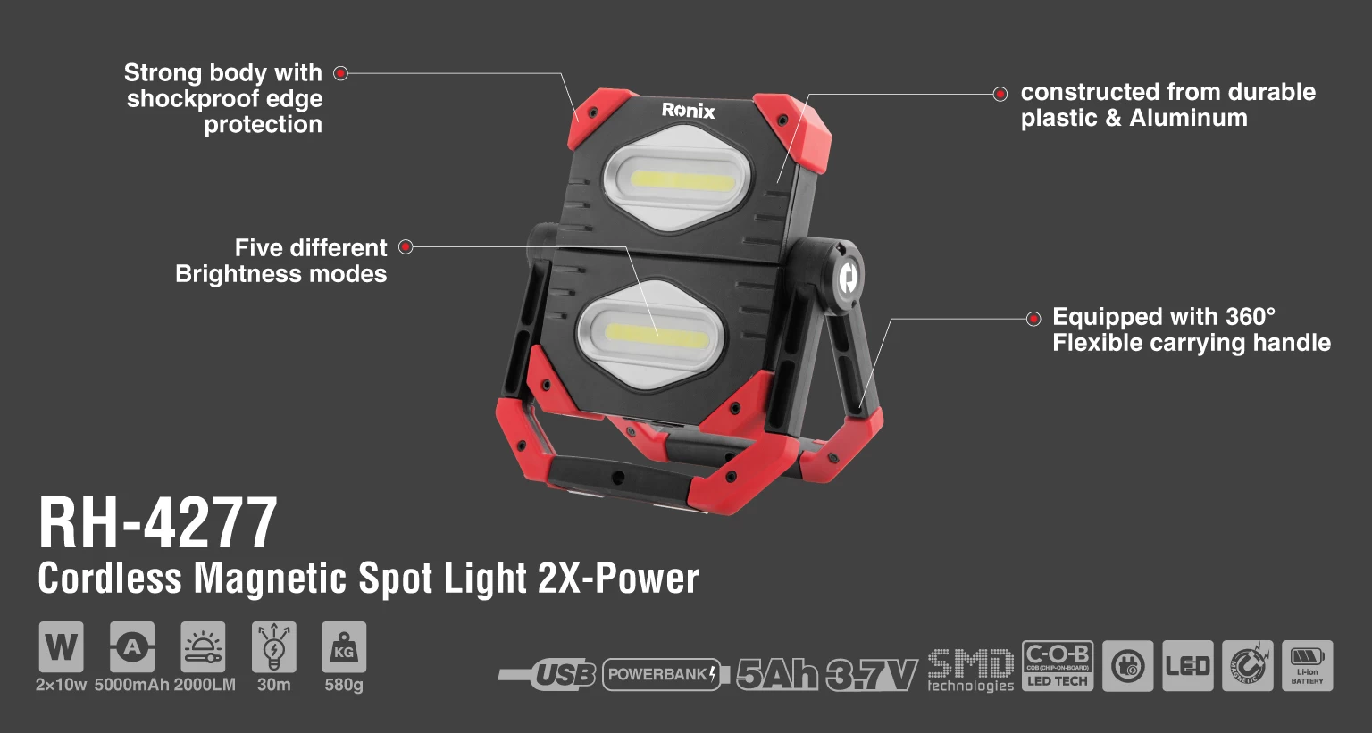 منبع تغذیه این ابزار، یک باتری 3.7 ولتی لیتیوم یونی است و روشنایی مورد نیاز شما را با دو عدد الایدی COB 10 واتی تامین میکند (مجموعاً 20 وات). همچنین، میتواند هر فضایی را تا دامنه 30 متر روشن کند. شار روشنایی آن در محدوده 2000 -20 لومن قابل تنظیم است و سه حالت مختلف روشنایی در آن با نور زیاد/کم/چشمکزن برای فعالیتهای مختلف تعبیه شده است. دمای رنگ نور (CCT)، میزان سردی یا گرمی رنگ نور خروجی از منبع نور را مشخص میکند. در این نورافکن، CCT در محدوده 6500 کلوین قرار دارد.