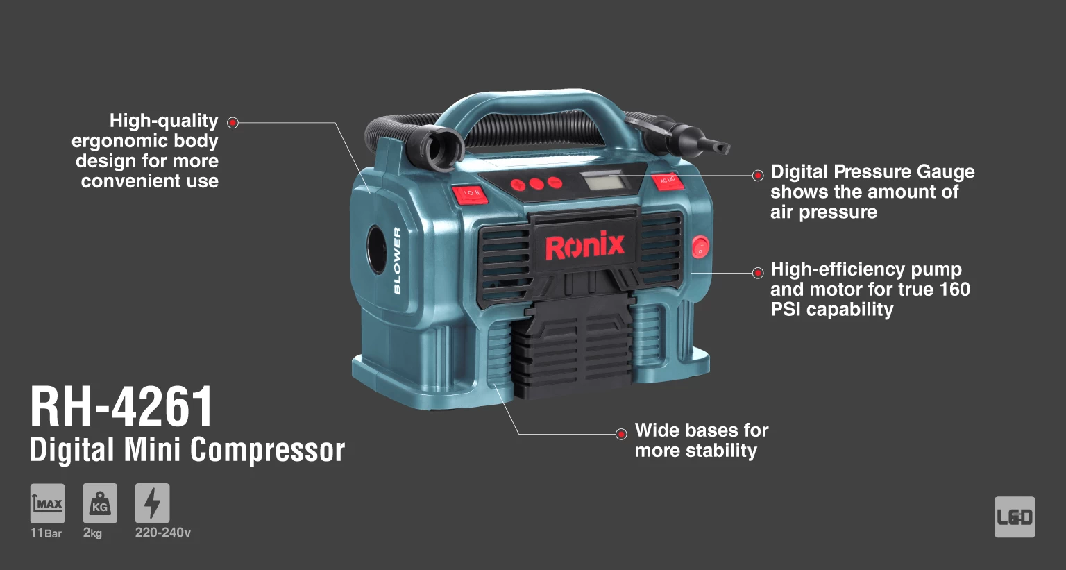 کمپرسورهای هوا، منبع تغذیه بسیاری از ابزارآلات در مشاغل و صنایع مختلف هستند و کاربردهای متنوعی دارند. چه کاربری خانگی باشید و چه حرفهای، ممکن است لازم باشد از مینی کمپرسور هوا برای کارهای خود استفاده کنید. مینی کمپرسور باد RH-4261 رونیکس، با نازل و مبدلهای مختلف، برای تمیزکاری داخل خودرو، بادکردن توپ، تشک و سایر تجهیزات بادی به شما کمک کند. این مینی کمپرسور باد، قابلیت استفاده با ولتاژ 220 ولت برق شهری و 12 ولت فندکی خودرو را دارد. این پمپ باد رونیکس، مجهز به یک نازل باد 81 سانتیمتری و خرطومی بلوور 36 سانتیمتری است. در بخش توضیحات محصول، با مشخصات مینی کمپرسور باد سهکاره دیجیتال فندکی و برق شهری RH-4261 رونیکس بیشتر آشنا شوید.
