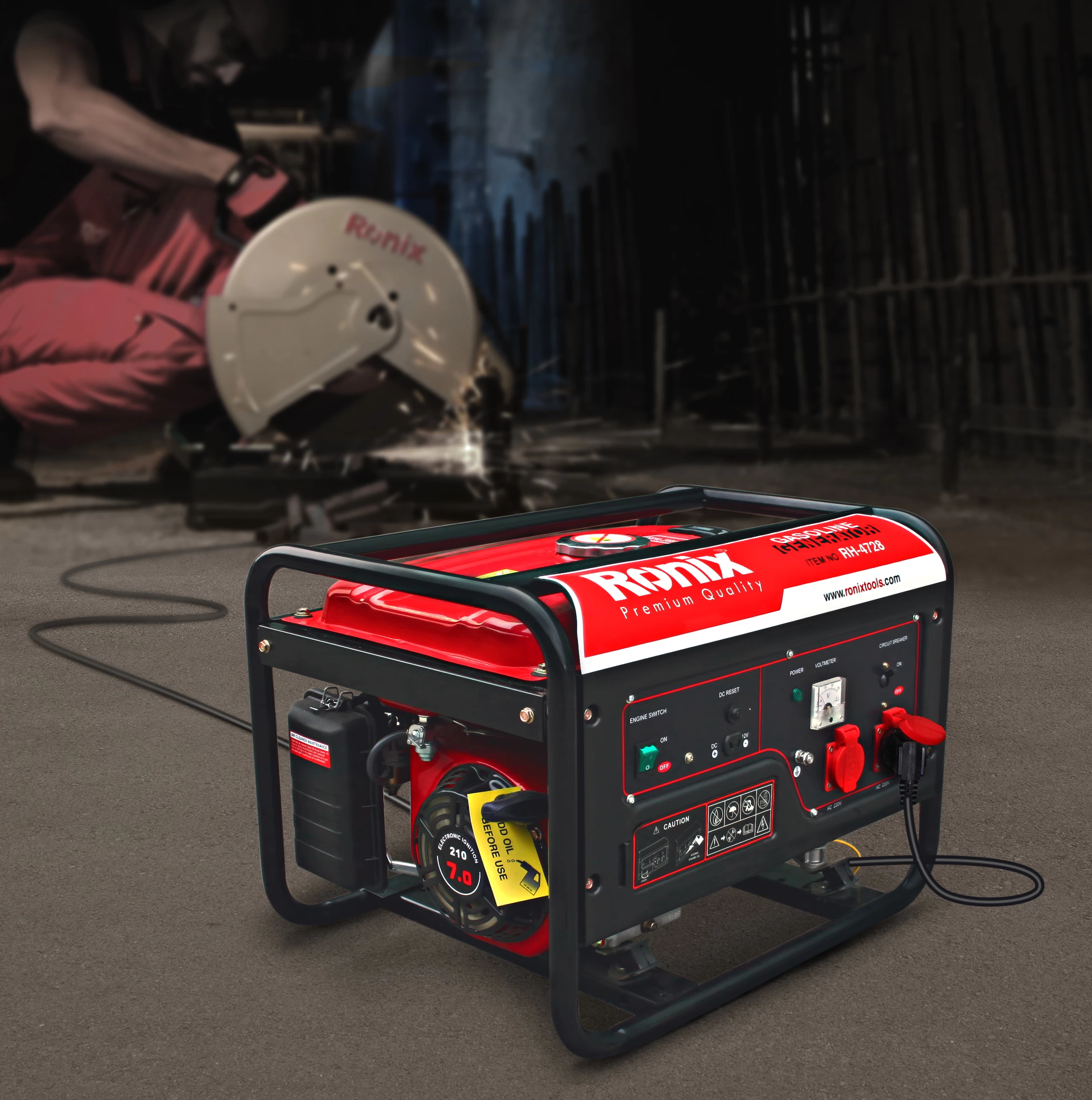 ژنراتور RH-4728 رونیکس، با نویز کمتر از 68 دسیبل کار میکند. همچنین، دارای 2 خروجی برق متناوب 220 ولت، یک خروجی 8 آمپر 12 ولت مستقیم و یک ولتمتر آنالوگ برای نمایش میزان اختلاف پتانسیل خروجی دستگاه نیز میباشد.