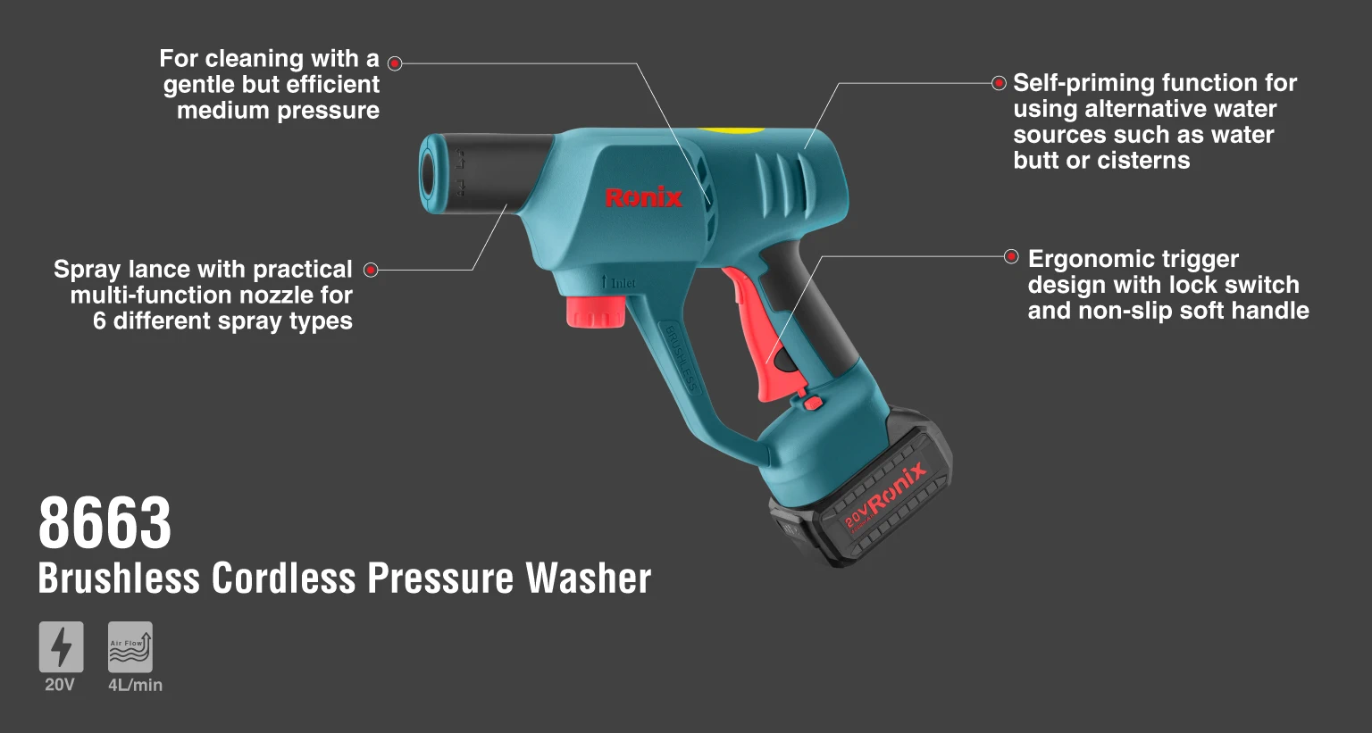 باتری این کارواش بادوام با ولتاژ 20 ولت و ظرفیت 4 آمپرساعت است و در یک ساعت به طور کامل شارژ میشود. باتری این کارواش ALL IN ONE است و در تمامی شارژیهای 20 ولت رونیکس قابل استفاده است.