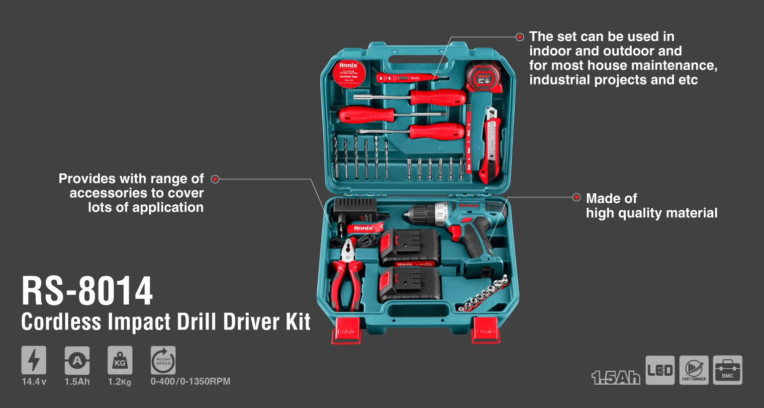 ست ترکیبی رونیکس مدل RS-8014، مجموعه کاملی از یک دریل شارژی قدرتمند 14 ولت و انواع ابزارآلات دستی پرکاربرد و متعلقات مورد نیاز است که در یک کیف مقاوم BMC به مشتری تحویل داده میشود.