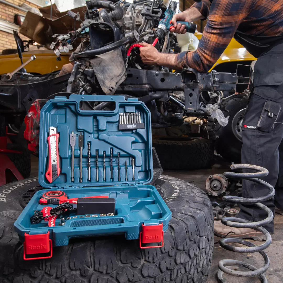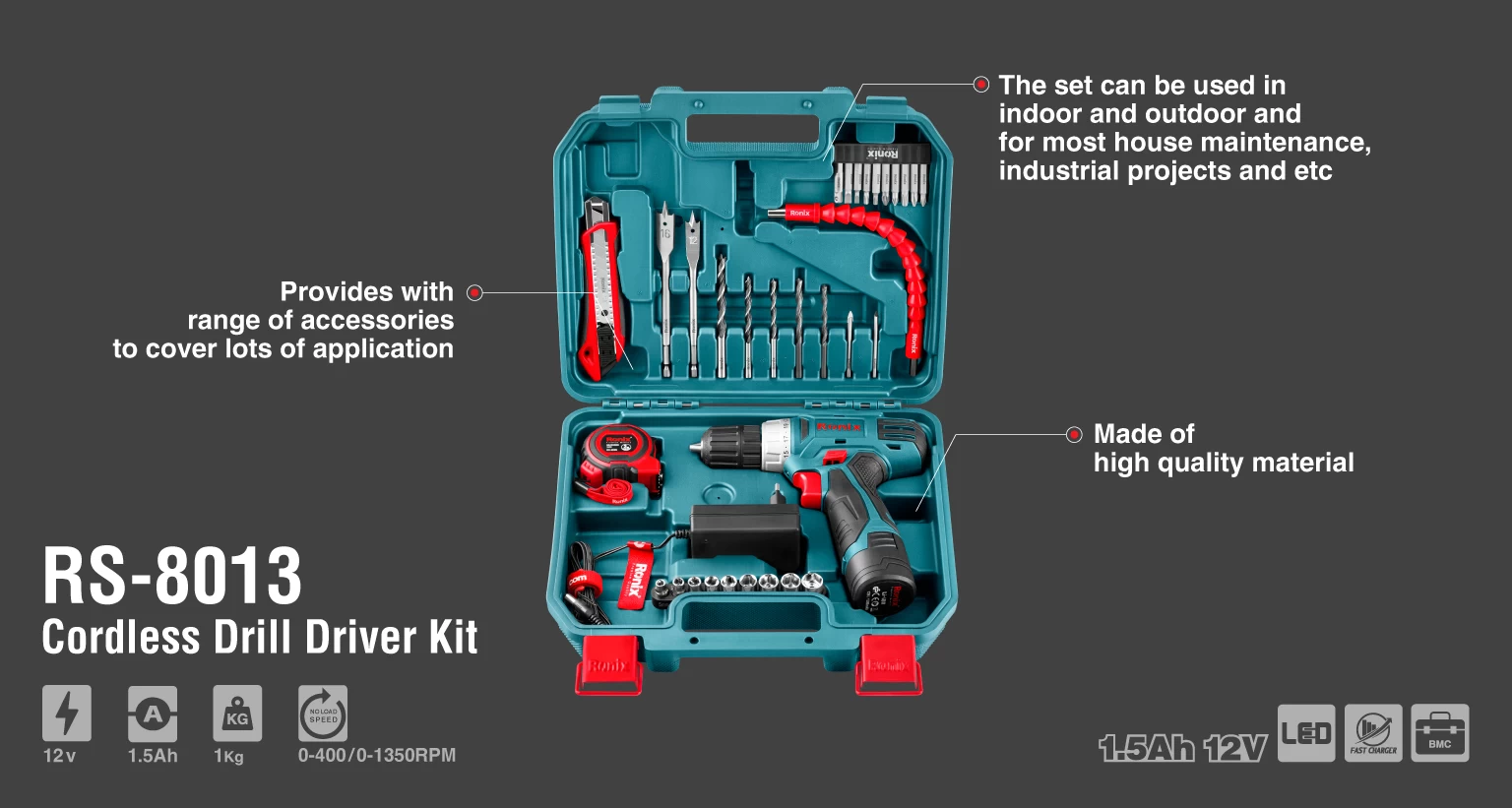 یک عدد باتری 12 ولت با ظرفیت 1.5 آمپرساعت و یک فست شارژر،متر3متری ،شفت رابط شلنگی، کاتر، 2عدد مته برگی ، 2عدد مته شیشه، 2عدد مته HSS Twist 3عدد مته چوب، سری ها پیچ گوشتی 50 میلیمتری کروم وانادیوم : PH1,PH2,PH3,PZ1,PZ2,ADA,T20,T25,SL4,SL6 سری بکس 1/4اینچی : 5,6,7,8,9,10,11,12,13 میلیمتری |