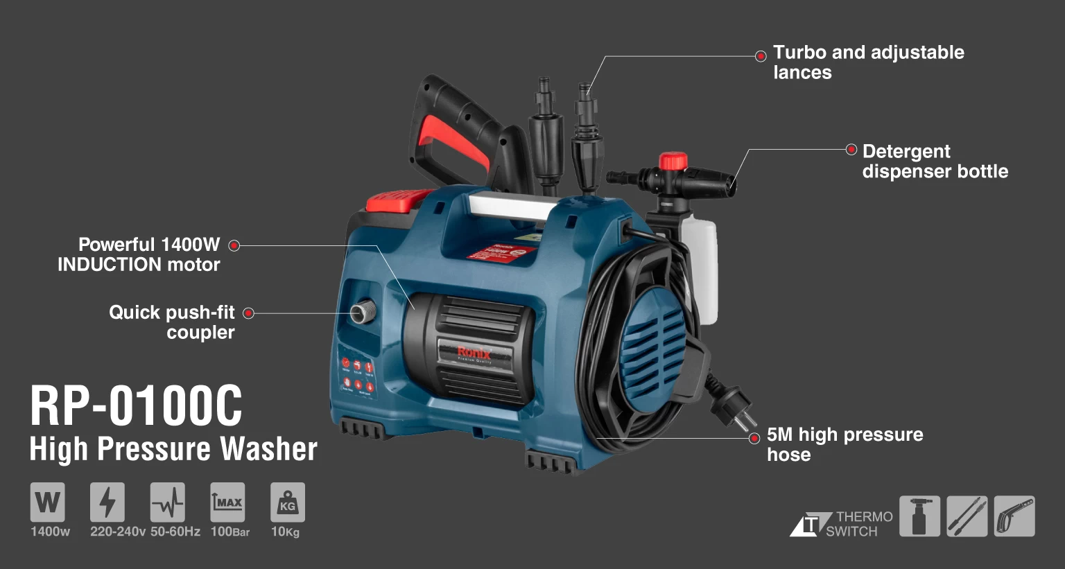 کارواش دینامی کامپکت RP-0100C رونیکس، به یک موتور یونیورسال قدرتمند و کمصدا با توان ۱۴۰۰ وات مجهز است که قدرت لازم را برای ایجاد حداکثر فشار آب خروجی را فراهم میکند. وزن این دستگاه 10 کیلوگرم بوده و میتواند در هر دقیقه 6 لیتر آب را با فشار 100 بار به بیرون بپاشد.