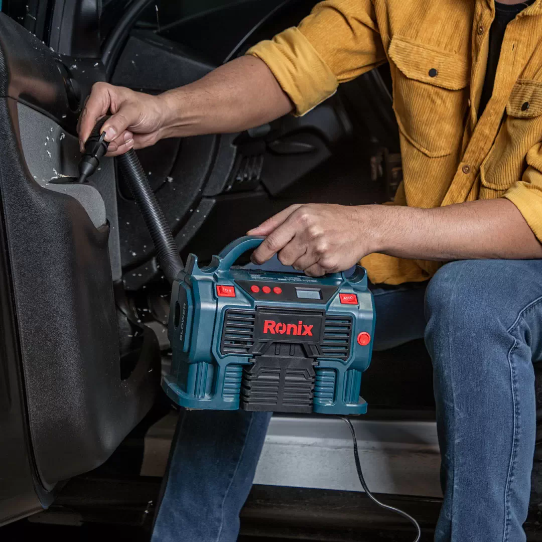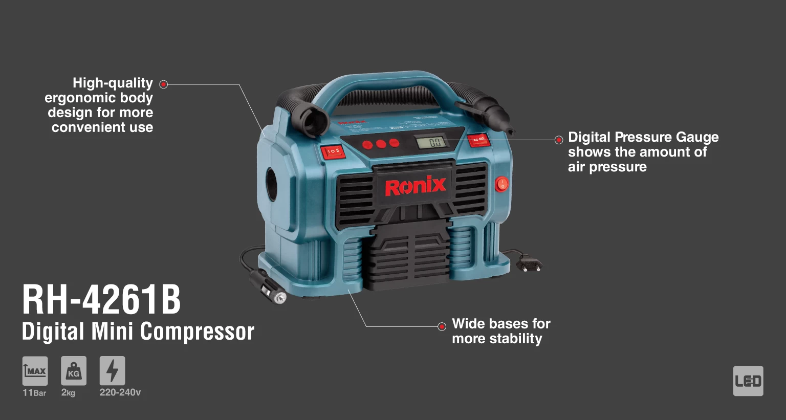 مینی کمپرسور باد RH-4261B رونیکس، با نازل و مبدلهای مختلف، برای تمیزکاری داخل خودرو، بادکردن توپ، تشک و سایر تجهیزات بادی طراحی و تولید شده است. منبع تغذیه این مینی کمپرسور باد، ولتاژ 220 ولت برق شهری یا 12 ولت فندکی خودرو است. همچنین، مجهز به یک نازل باد 81 سانتیمتری و خرطومی بلوور 36 سانتیمتری است. این دستگاه همراه با یک کیف برزنتی محکم به بازار ابزار ایران عرضه میشود. در بخش توضیحات محصول، مینی کمپرسور باد سهکاره دیجیتال فندکی و برق شهری رونیکس مدل RH-4261B بیشتر بررسی میشود.