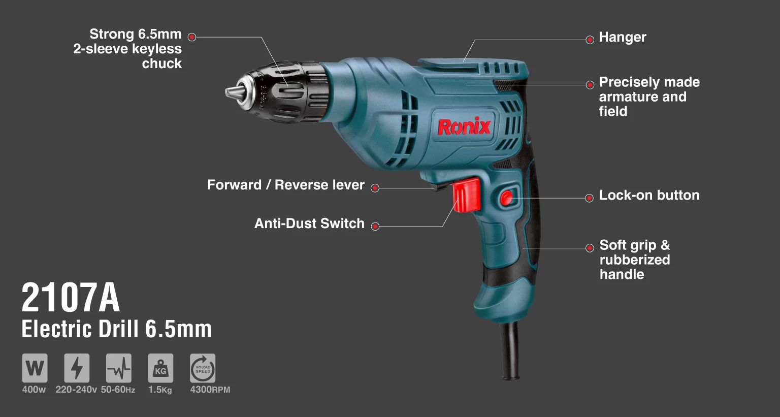 دریل برقی 2107A رونیکس، مجهز به موتور قدرتمند 400 وات، متشکل از آرمیچر و بالشتکهای صنعتی و سرعت گردش 4300 دور در دقیقه است که قابلیت سوراخکاری و بستن پیچ را در مواد چوبی و فلزی برای این دستگاه ایجاد میکند. سه نظام 6.5 میلیمتری دو تکه و اتوماتیک این دریل، برای تعویض مته نیازی به آچار ندارد و در نتیجه، سرعت تعویض مته را افزایش میدهد. طراحی ارگونومیک بدنه و دسته نیز موجب سهولت کاربرد و کنترل بهتر این دریل شده و از لغزش ابزار در دست افراد جلوگیری میکند. در نتیجه، دقت و تسلط کاربر هنگام کار بیشتر میشود.