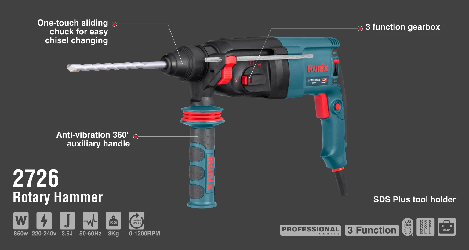 موتور قدرتمند 850 وات؛ ولتاژ 240-220 ولت؛ فرکانس 60-50 هرتز؛ سرعت در حالت آزاد در محدودهی 1200-0 دور بر دقیقه؛ قابل تنظیم در 4 عملکرد مجزای سوراخکاری، سوراخکاری چکشی، تخریب و خلاصکن