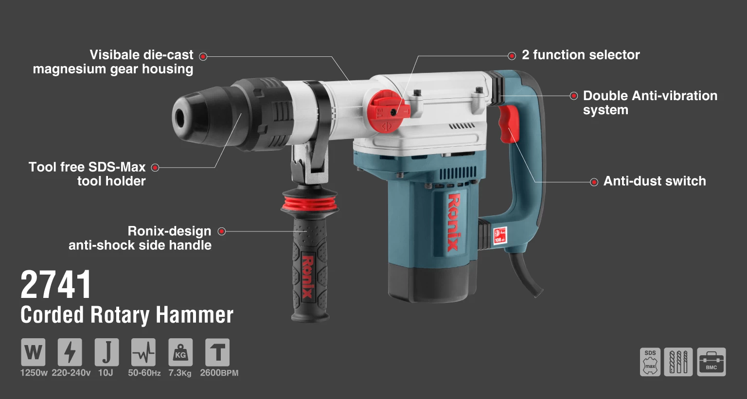 بتنکن 2741 رونیکس مجهز به یک ابزارگیر 40 میلیمتری SDS-MAX است. از دیگر ویژگیهای این دستگاه میتوان به قابلیت تنظیم و تثبیت سرعت توسط دیمر الکترونیکی، سیستم دقیق دوران قلم، سیستم ضد لرزش حرفهای و سیستم کلاچ ایمنی اشاره کرد.