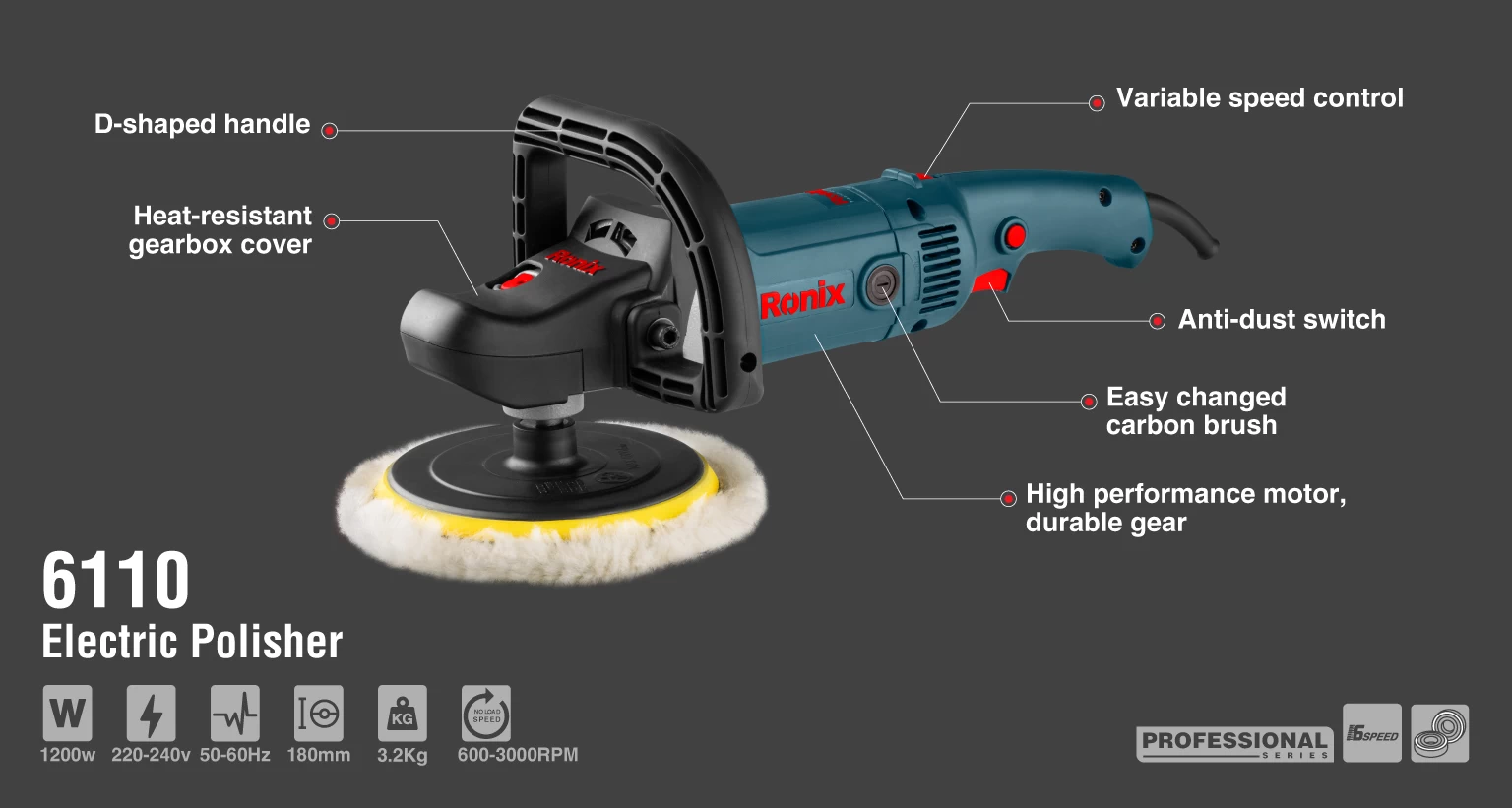 برای آشنایی بیشتر با ویژگیهای پولیش برقی دیمردار 180 میلیمتر 1200 وات رونیکس با مدل 6110، بخش توضیحات محصول راهنمای خوبی برای شما خواهد بود.