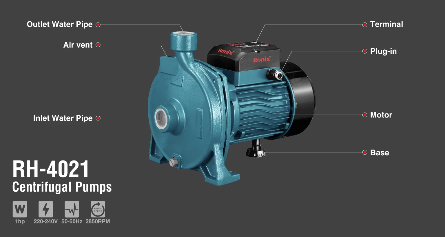 الکترو پمپ آب سانتریفیوژی با استهلاک کم و نگهداری آسان، پرکاربردترین نوع پمپ در جهان است. از پمپ آب بشقابی 1 اسب بخار رونیکس مدل RH-4021، برای مصارف خانگی، توزیع آب در ساختمانهای با فشار آب کم و متوسط، انتقال مایعات، آبیاری باغ و ... استفاده میشود.