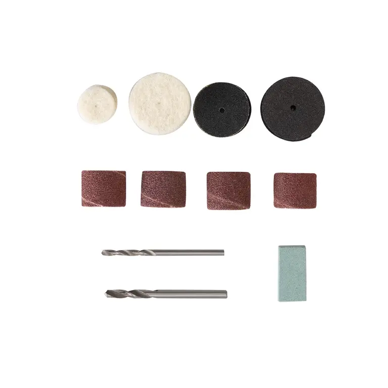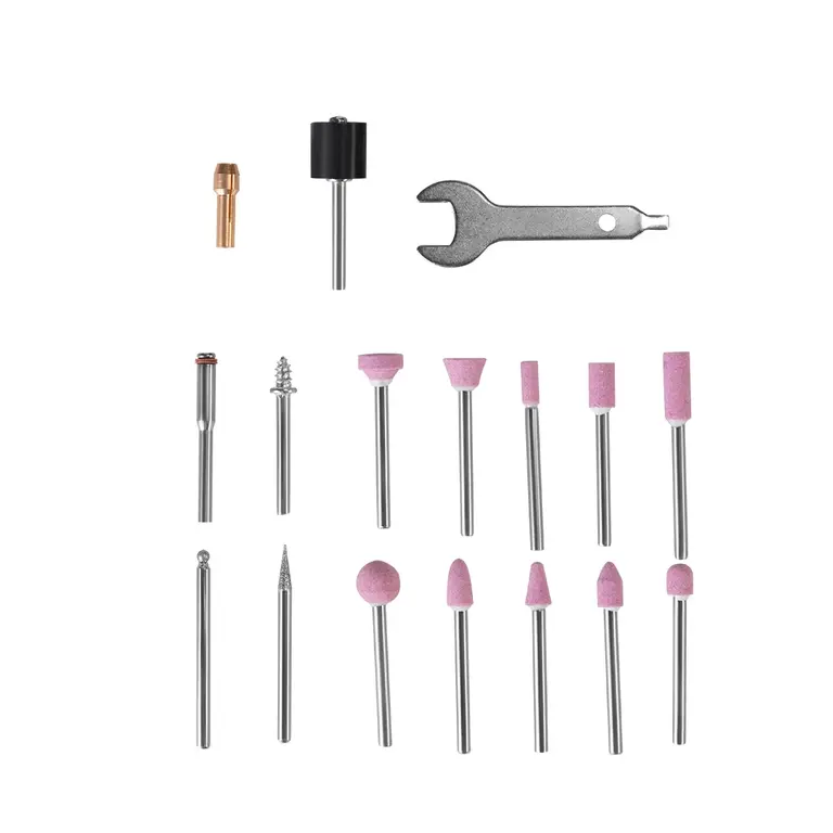یک عدد شفت سنبادهی 3.2 میلیمتر، دو عدد سنبهی 3.2 میلیمتر، دو عدد متهی 3.2/2.3 میلیمتر، دو قطعه الماس 3.2 میلیمتر، یک عدد سنگ سنباده، آچار، دو عدد کولت 3.2/2.3 میلیمتری، چهار عدد سنبادهی انگشتی، هشت عدد سنگ برشی، سه عدد کاغذ سنباده، چهار عدد نمد، ده عدد سنگ سنباده با شفت 3.2 میلیمتری