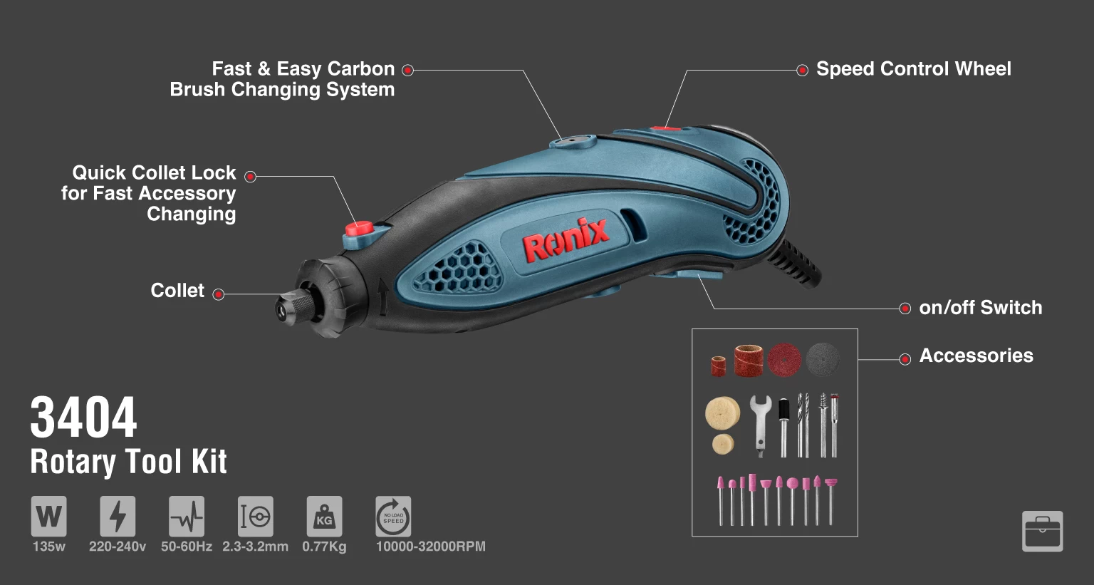 فرزهای مینیاتوری موجود در بازار متنوع هستند و ویژگیهای متفاوتی دارند. لازم است با ویژگیهای مهم این محصول آشنایی داشته باشید تا هنگام خرید آن بتوانید با توجه به نوع نیاز و کاربری مورد نظر خود، بهترین مورد را انتخاب کنید. قدرت موتور، ولتاژ دستگاه، طراحی و جنس بدنه، متعلقات و لوازم جانبی ابزار، مهمترین عوامل موثر بر کیفیت کار با فرز مینیاتوری هستند. در این بخش، ویژگیهای کیت فرز مینیاتوری 3404 رونیکس بررسی میشود.