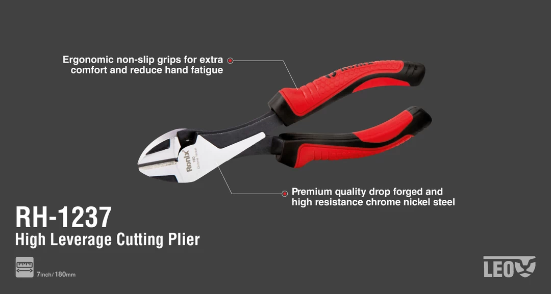 قیچی سیمبر RH-1237 یا سیمچین کله گاوی رونیکس، با فکهای قدرتمند و لبههای برش دقیق خود، بهترین کارایی را در صنعت برق و الکترونیک برای برش انواع سیم نرم و سخت دارد. این سیمچین مدل لئو، به سایز 7 اینچ، معادل 180 میلیمتر به بازار ابزار ایران عرضه میشود. فکهای تقویتشده این ابزار دستی پرکاربرد و قدرتمند، به ثابت نگهداشتن قطعه کار کمک میکند. بدنه این محصول از جنس فولاد فورجشده آلیاژ کروم نیکل است که کار در شرایط مختلف محیطی را برای شما امکانپذیر میکند. استفاده از روکش مقاوم و ضد لغزش در این سیمچین، از دیگر ویژگیهای آن است. سیمچین RH-1237 رونیکس مجهز به تیغههای تیزی است که با کمک آن میتوانید مقاطع سیم را با دقت بسیار بالا برش بزنید. در بخش توضیحات محصول، بیشتر با مشخصات سیمچین کلهگاوی 7 اینچ RH-1237 رونیکس مدل لئو آشنا شوید.