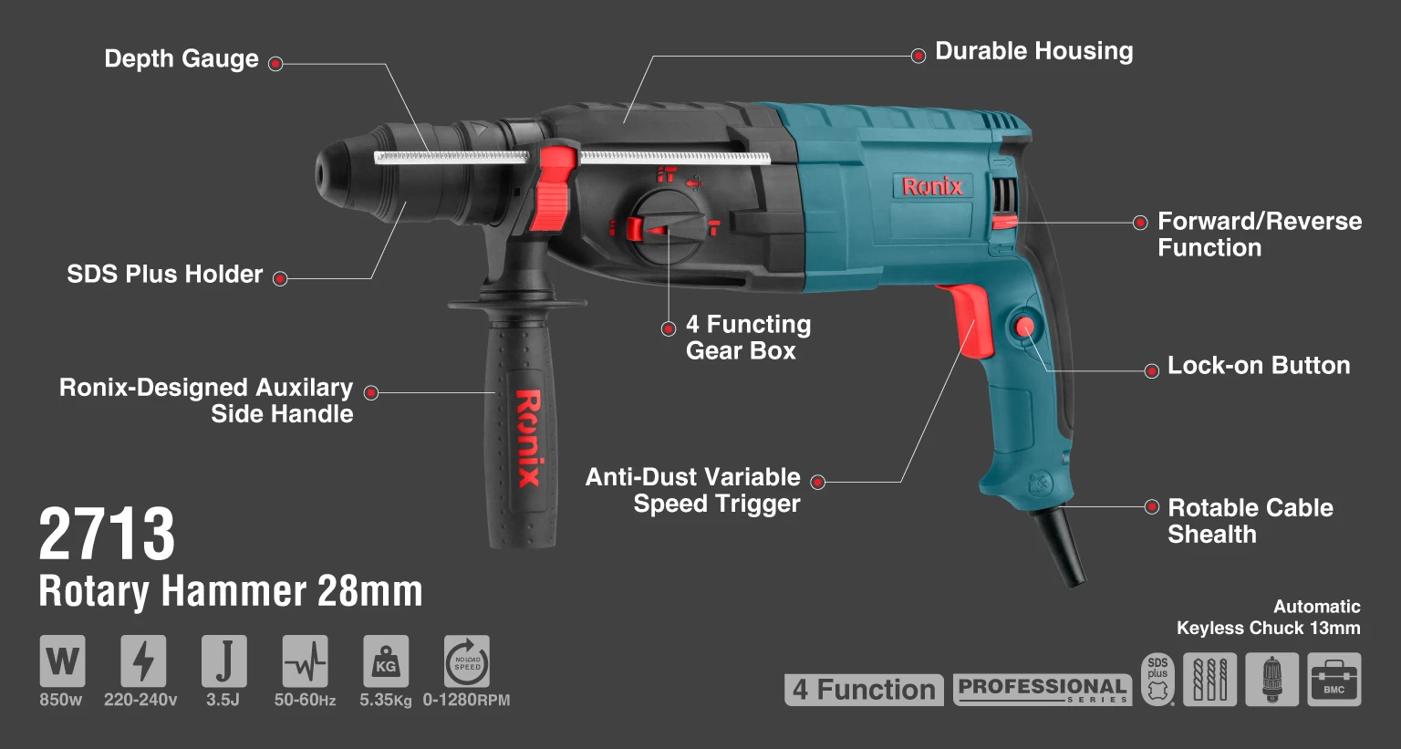 موتور قدرتمند به توان 850 وات؛ ولتاژ 240-220 ولت؛ فرکانس 60-50 هرتز؛ سرعت در حالت آزاد 1280-0 دور بر دقیقه؛ قابلیت انجام 3 عملکرد مجزای سوراخکاری، سوراخکاری چکشی و تخریب