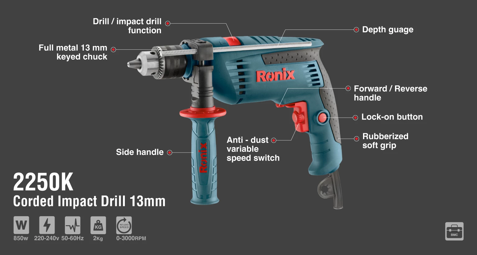 در بخش جزئیات محصول، مشخصات کیت دریل برقی چکشی 13 میلیمتری آچاری 850 وات 3000 دور رونیکس مدل 2250K بیشتر بررسی شده است.