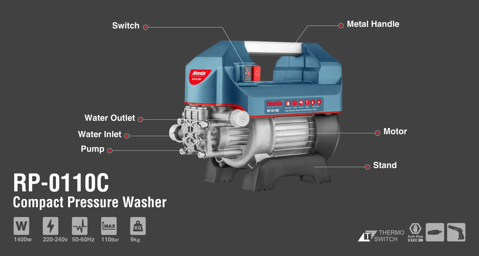 کارواش دینامی کامپکت RP-0110C رونیکس، به موتور دینامی قدرتمند و کمصدای ۱۴۰۰ وات مجهز است که قدرت لازم را برای ایجاد حداکثر فشار آب خروجی به میزان 110 بار فراهم میکند. وزن این دستگاه 9 کیلوگرم بوده و میتواند در هر دقیقه 6 لیتر آب را با فشار 110 بار به بیرون بپاشد.