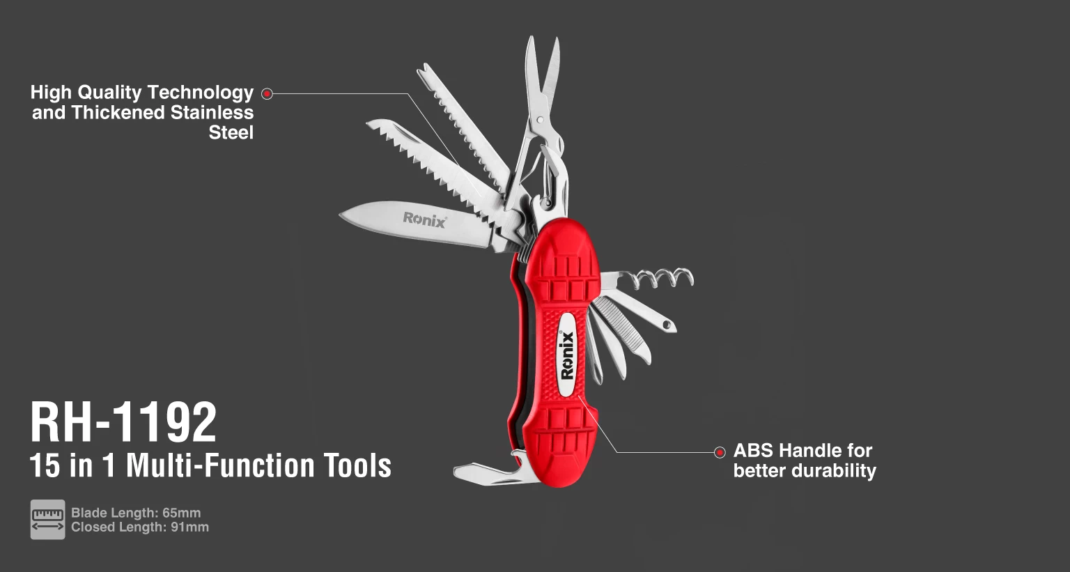 15 قابلیت این محصول همهکاره رونیکس عبارتند از: چاقو، قلاب بازکن، ابزار تمیزکاری پوست ماهی، اره، قیچی، کنسرو بازکن، درب بازکن، پیچ گوشتی دوسو، پیچ گوشتی چهارسو، یخشکن، تیغه تمیزکاری ناخن، سوهان ناخن، سمبه، چوبپنبه بازکن و حلقه کلید