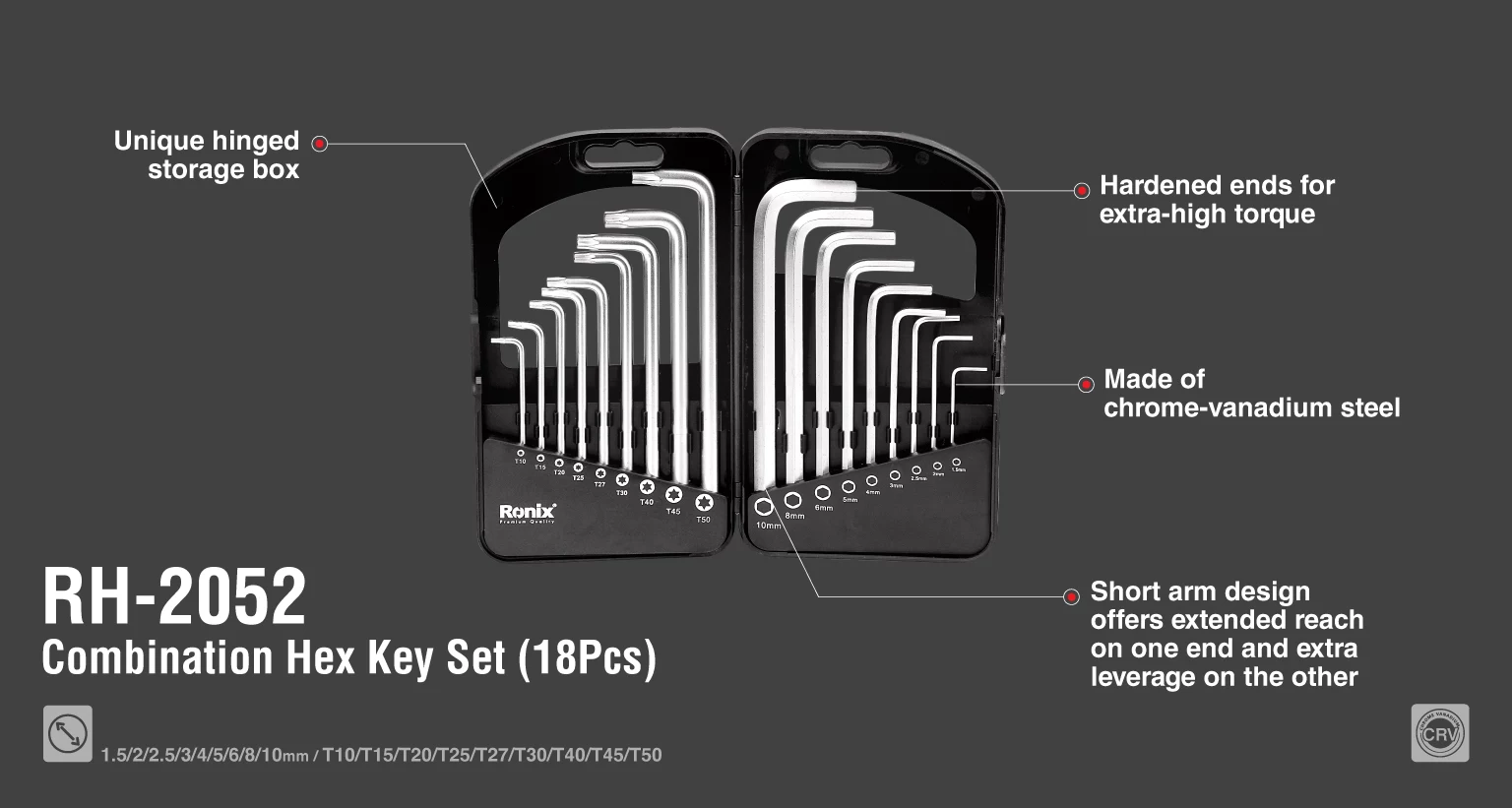 محصول RH-2052 رونیکس ابزاری کامل و کار راه بنداز است. مجموعهای 18 عددی متشکل از 9 آچار آلن شش گوش و 9 آچار آلن ستارهای.