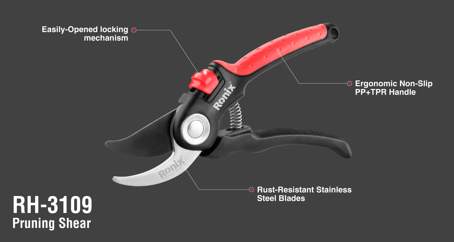 قیچی باغبانی انواع مختلفی دارد. قیچی باغبانی شاخهزن، شمشادزن، قیچی چمنزنی، قیچی هرس و ... همگی مثالهایی از تنوع این ابزار هستند. دسته در این قیچیها حکم اهرم را دارد. یکی از دو لبه فلزی تیز در این قیچیها ثابت بوده و به عنوان تکیهگاه عمل میکند. لبه دیگر متحرک است که کار برش و قطعکردن را انجام میدهد. محصول RH-3109 رونیکس، برای هرس شاخههای درختان، درختچهها و بوتههای باغ شما طراحی و تولید شده است.