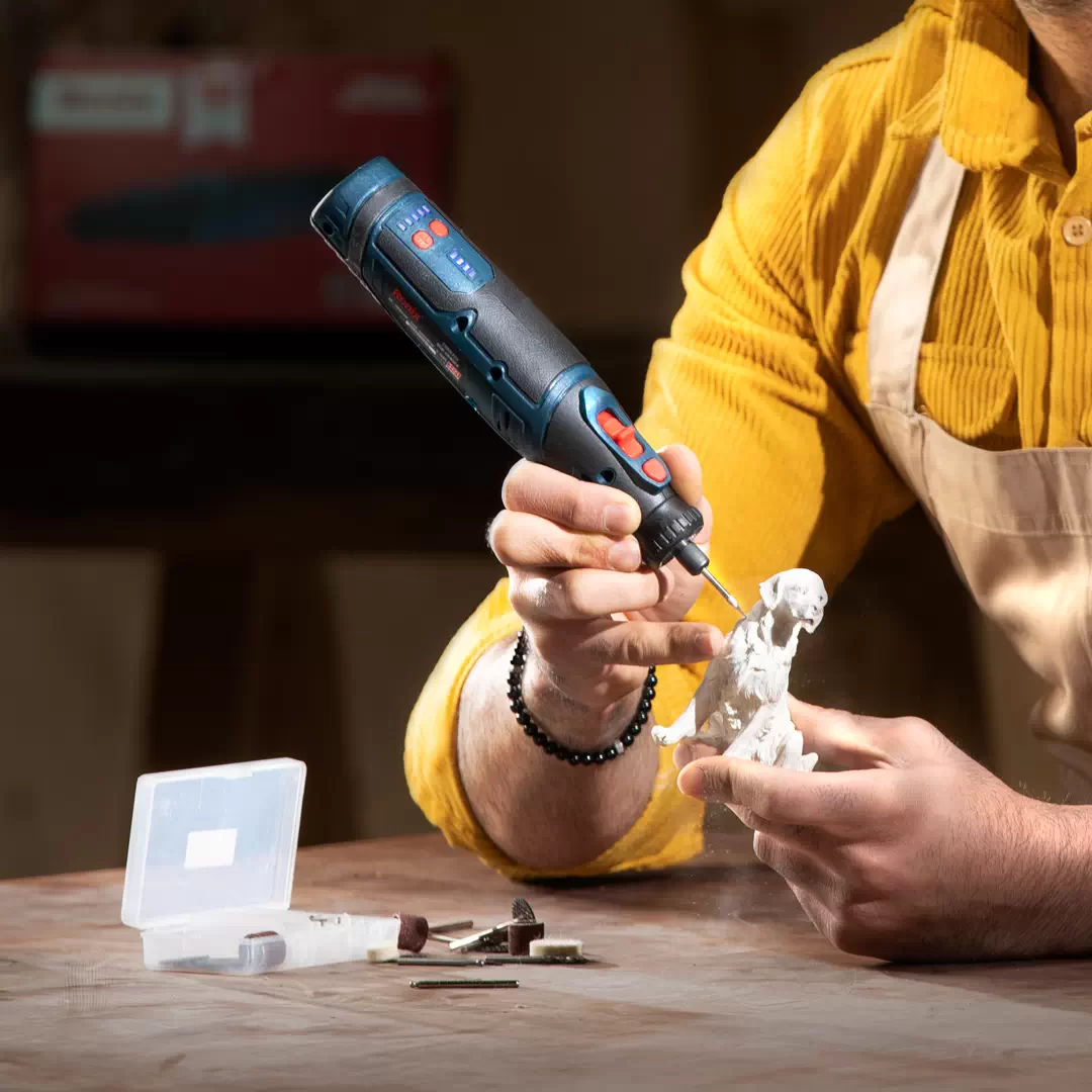 فرز مینیاتوری شارژی 3421 رونیکس مجهز به یک موتور DC 8 ولت است که سرعتی بالغ بر 30000 دور در دقیقه را تولید کرده و به ابزارگیر 3.2 میلیمتری خود منتقل میکند؛ سرعتی که در 5 حالت مختلف، در بازه 5000 تا 30000 دور در دقیقه و متناسب با سطح کار شما قابل تنظیم است.