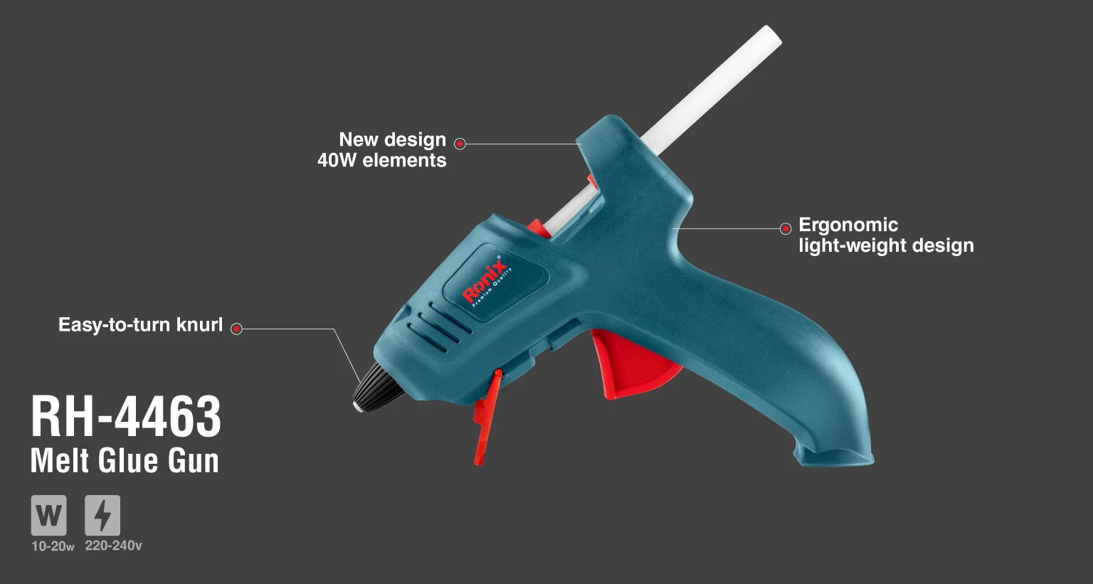 تفنگ چسب حرارتی 20 وات جدید رونیکس مدل RH-4463 در جعبه رنگی رونیکس همراه با دو لوله چسب حرارتی تفنگی به بازار ابزار ایران عرضه میشود.