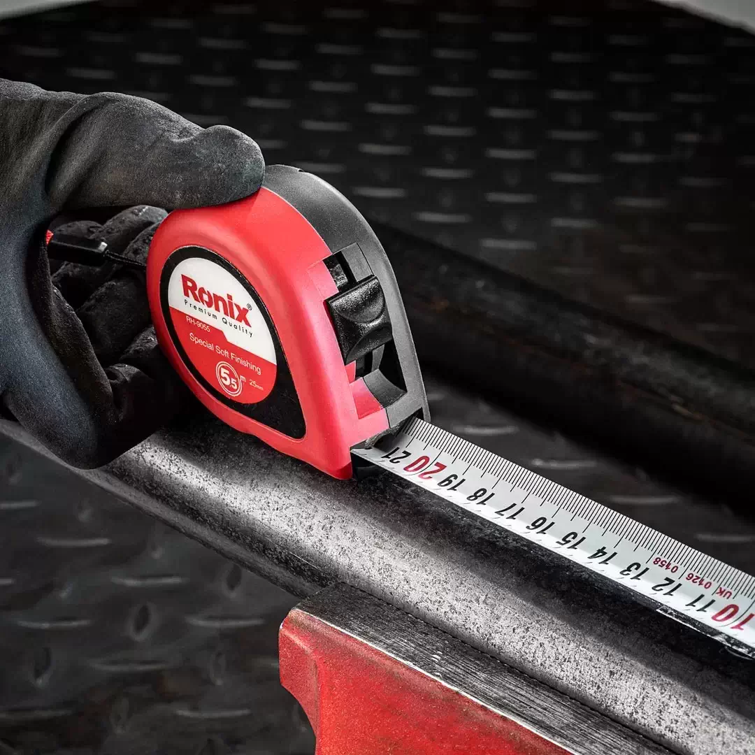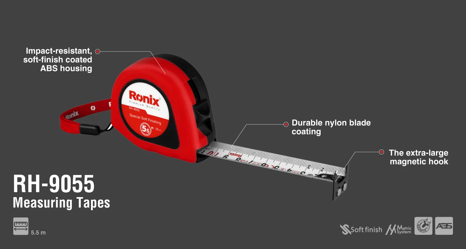 متر روکش دار 5.5 متری RH-9055 رونیکس دارای تیغه به عرض 25 میلیمتر و ضخامت 0.11 میلیمتر با پوشش نایلون است که باعث افزایش مقاومت آن در شرایط مختلف میشود.