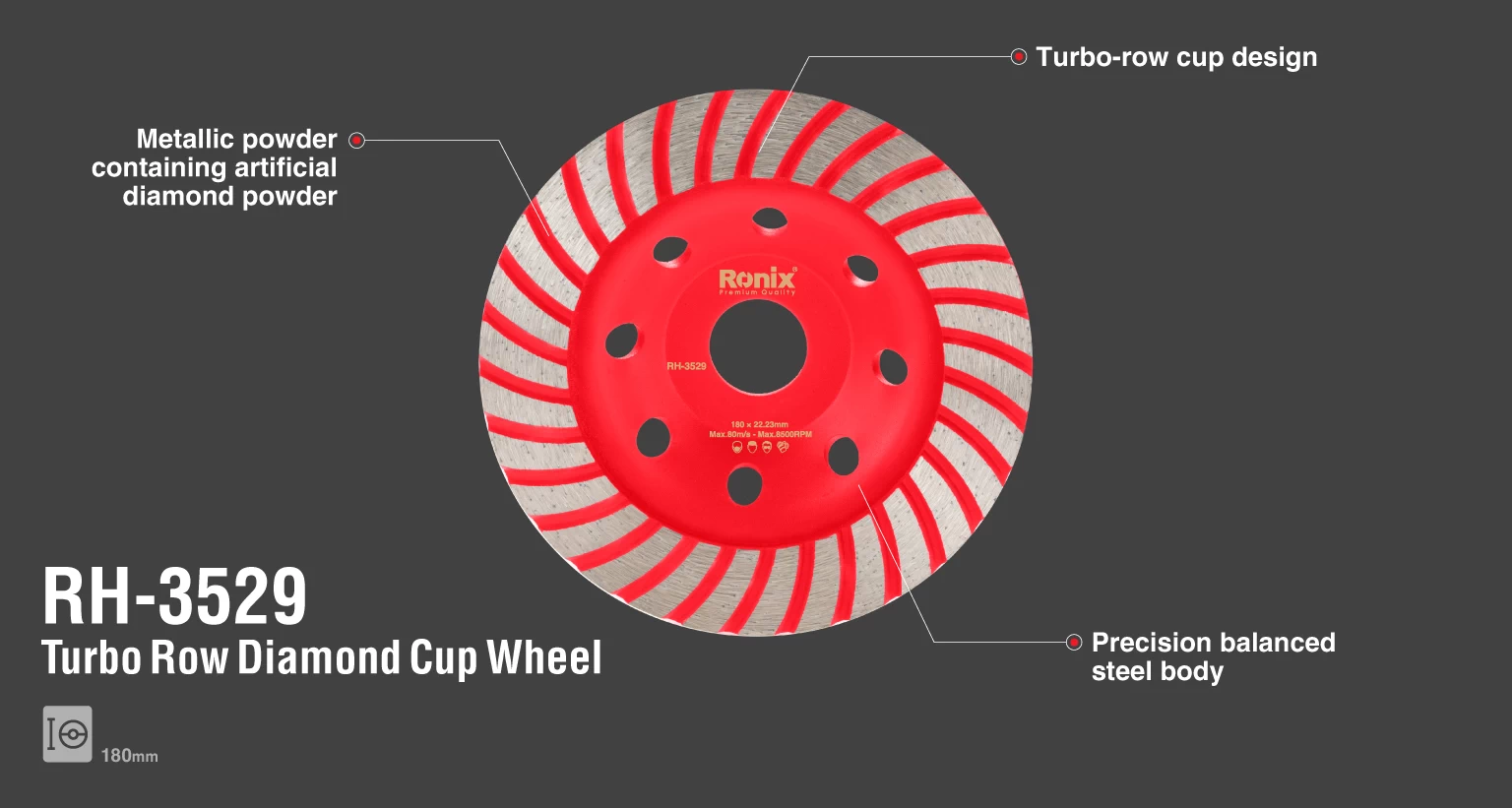 صفحه گرانیتساب کاسهای RH-3529 توربو با قطر 180 میلیمتر، با جدیدترین تکنولوژی روز دنیا ساخته شده و مقاومت بسیار بالایی دارد.