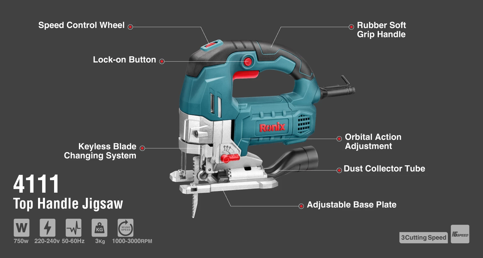 سیستم اتوماتیک تعویض تیغه نیز با هدف کاربری آسان و سریع در این ابزار تعبیه شده است. در اره عمودبر 4111 رونیکس، جریان ایجادشده از دیمر، کلید و برد الکترونیکی به سیمپیچ و کلکتور مسی با درصد خلوص مس بالا میرسد تا دستگاه با توان حداکثری خود شروع به کار کند. اره برقی عمودبر گیربکس فلزی 750 وات رونیکس با مدل 4111، از لحاظ تمام ویژگیها و کاربردها، همرده سوپربرندهای جهانی طراحی و تولید شده است.