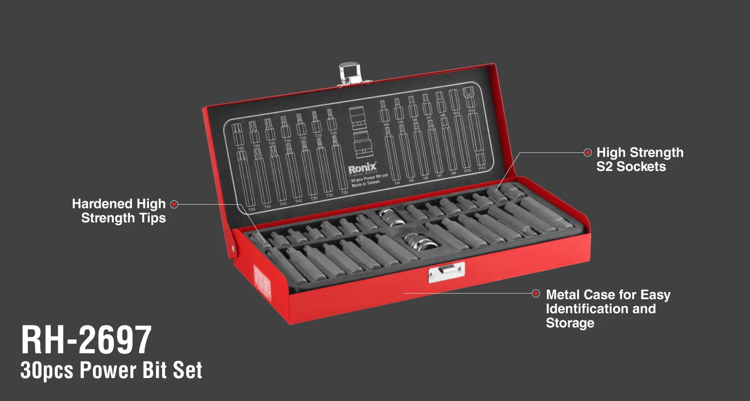 جعبه بیت ترکیبی 30 پارچه ستارهای و ششگوش رونیکس مدل RH-2697، متشکل از انواع بیت، سری و رابط با سایزهای مختلف است که برای مصارف عمومی، صنعتی، مکانیکی و تاسیسات طراحی و ساخته شدهاند. کیفیت بالای تکتک قطعات و طراحی حرفهای رونیکس باعث شده تا این جعبه بیت به انتخاب اول کاربران حرفهای تبدیل شود.
