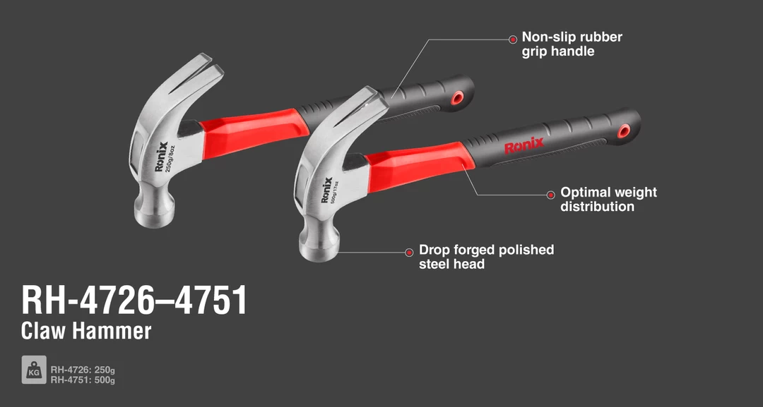 ابزار مدل RH-4751 رونیکس، یک چکش دوشاخ با سطح مقطع گرد و دارای دسته ضد لغزش و ارگونومیک از جنس فایبرگلاس است. همچنین روکش دسته از جنس پلاستیک ضد تعریق است که موجب سهولت کاربری این ابزار می‌شود.