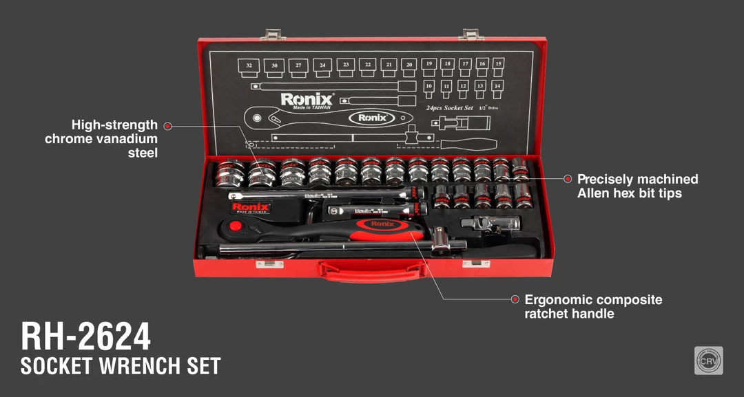 مجموعه بکس 24 عددی رونیکس مدل RH-2624 مجموعه ‌ای دارای 24 قطعه، ساخته شده از مواد باکیفیت سخت‌ کاری شده با گشتاور بالا می باشد. این ست دارای سوکت‌ های فولادی از جنس کروم وانادیوم با مقاومت و استحکام بالا است که با کروم شفاف آینه ‌ای روکش شده ‌اند تا در برابر زنگ‌ زدگی و خوردگی مقاوم باشند. لبه‌ سوکت ‌ها در این محصول به دقت تراش خورده اند که این ویژگی با ایجاد اندازه ‌های دقیق و انتهای مورب در سوکت ‌ها، قرار دادن بکس بر سطح کار را آسان نموده و از خود دستگاه و سطح کار در برابر آسیب حاصل از لبه ‌های تیز سوکت محافظت می‌کند.