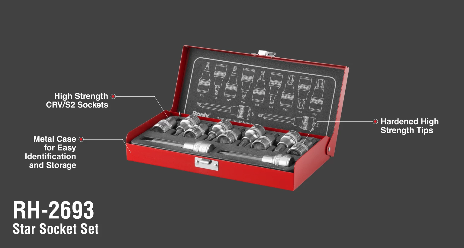 جعبه بکس RH-2693 شامل 11 عدد آلن ستارهای و 11 عدد سوکت با سایزهای متنوع است که برای کارهای مکانیکی، تاسیسات، مونتاژ و ... قابل استفاده هستند.