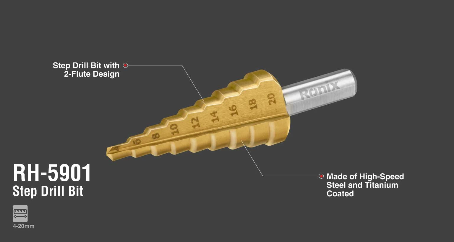 این مته 9 پلهای با طراحی دو شیار برای سوراخکاری در ورق های آهن، فولاد ضد زنگ، مس، آلومینیوم کاربرد دارد. در بخش توضیحات محصول، بیشتر مشخصات مته مخروطی رونیکس مدل RH-5901 را بررسی کنید
