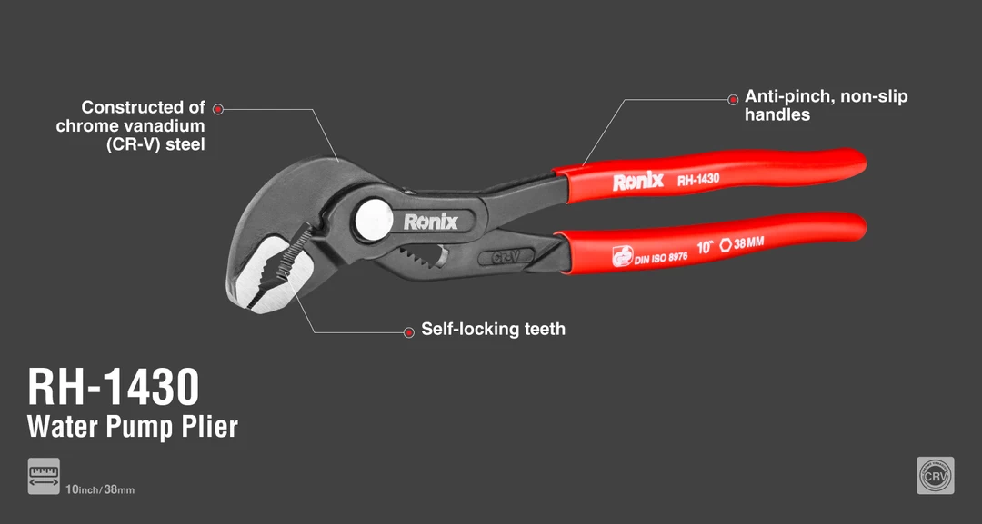 انبر واتر پمپ یا انبر کلاغی RH-1430 رونیکس، بدنهای از جنس فولاد کروم وانادیوم ضد زنگ دارد و به دستهای ارگونومیک مجهز است تا کاربران بتوانند راحتتر با آن کار کنند.