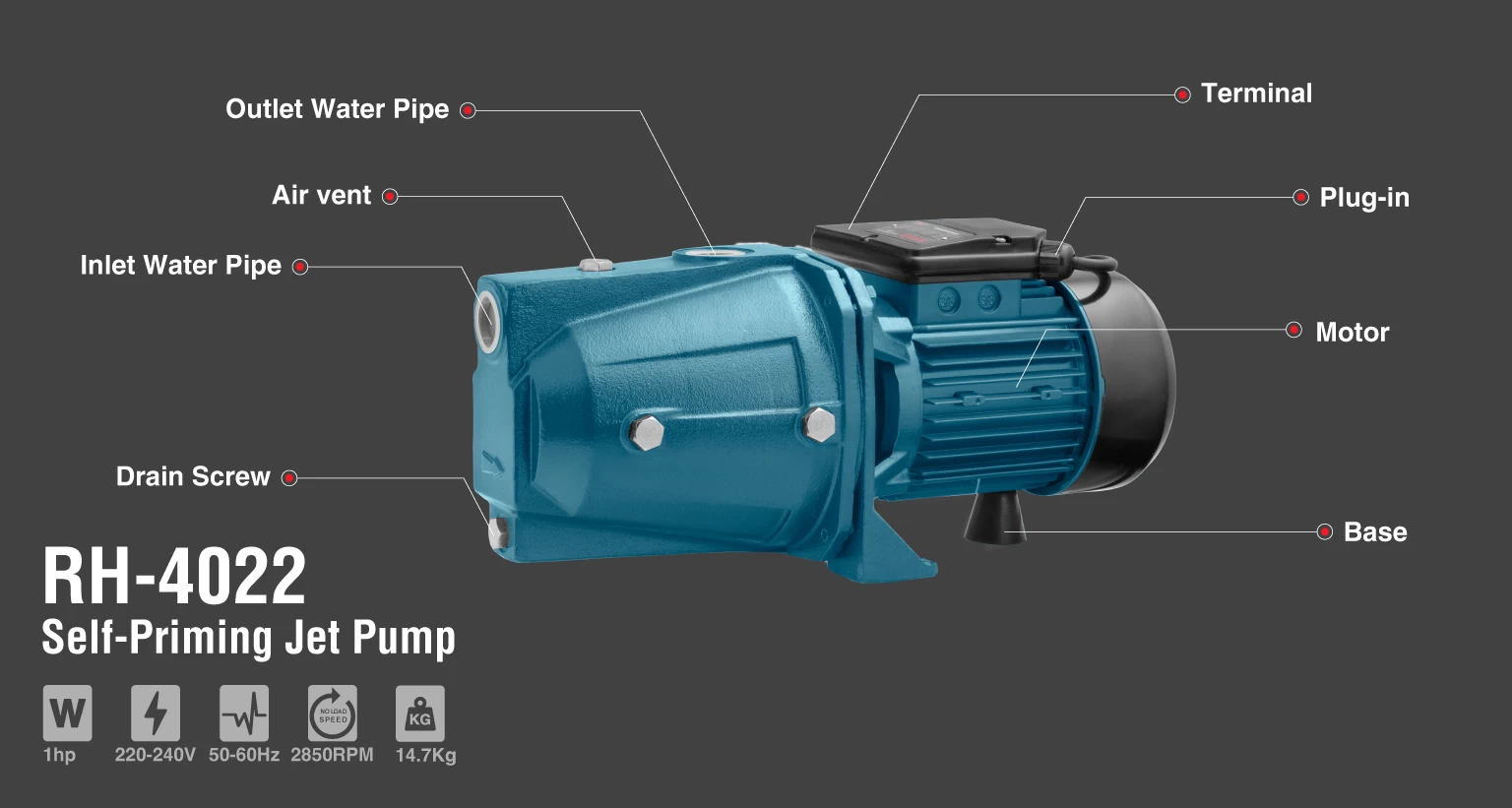 این پمپ با ایجاد خلاء در قسمت مکش، هوا را خارج کرده و آب یا سیالات دیگر را پمپاژ میکند. این محصول، با ظرفیت مکش بالایی طراحی شده و عمل پمپاژ را حتی با وجود حبابهای هوا در سیال انجام میدهد. خودمکشبودن پمپ آب جتی RH-4022 رونیکس، یکی از مهمترین از مزایای آن است و در شرایطی که دبی کمی وجود دارد، فشار بیشتر و هد بالایی را ایجاد میکند.
