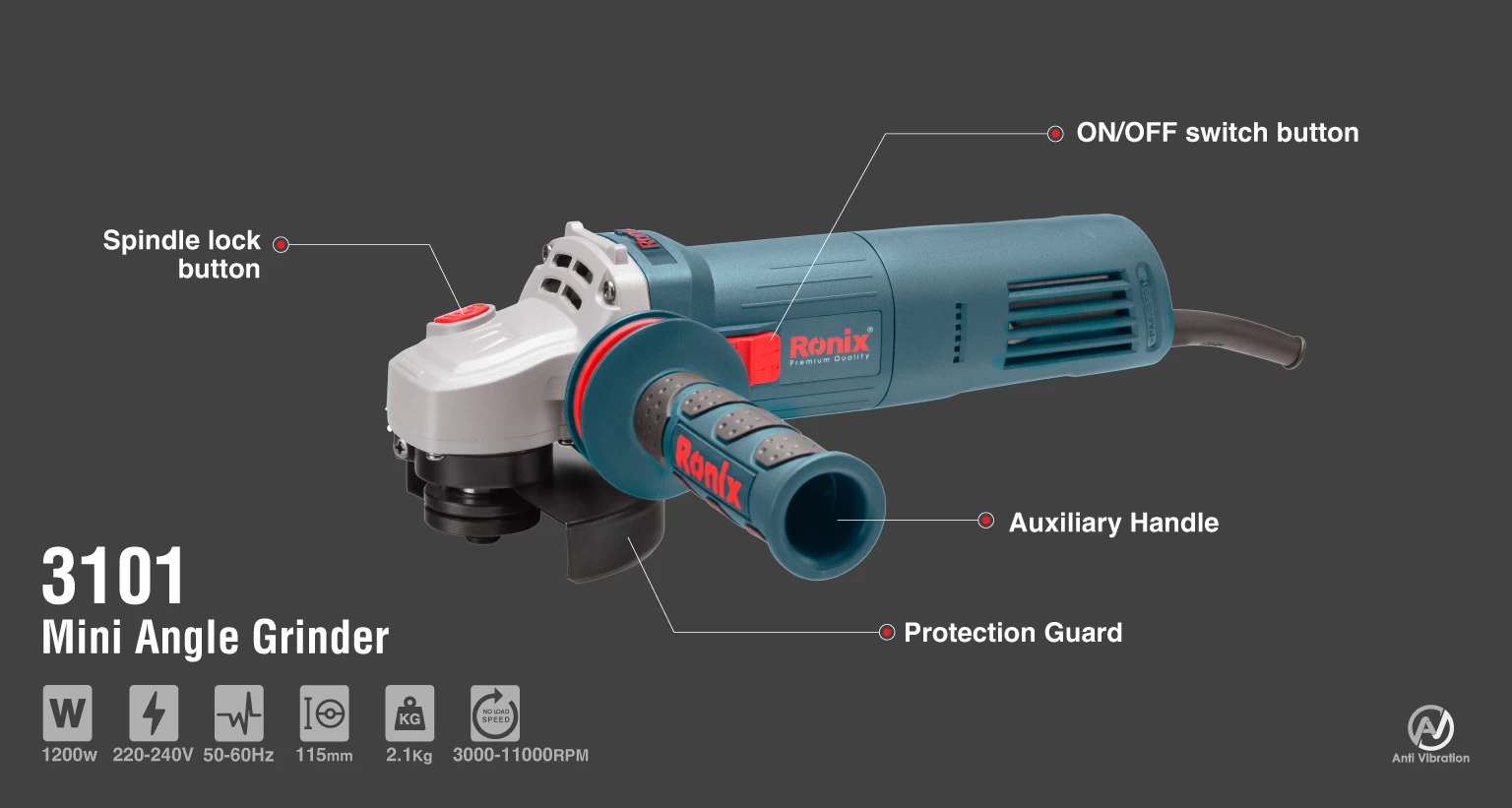 ارائهشده در جعبه رنگی رونیکس همراه با دسته جانبی، محافظ صفحه 115 میلیمتر، ذغال، آچار