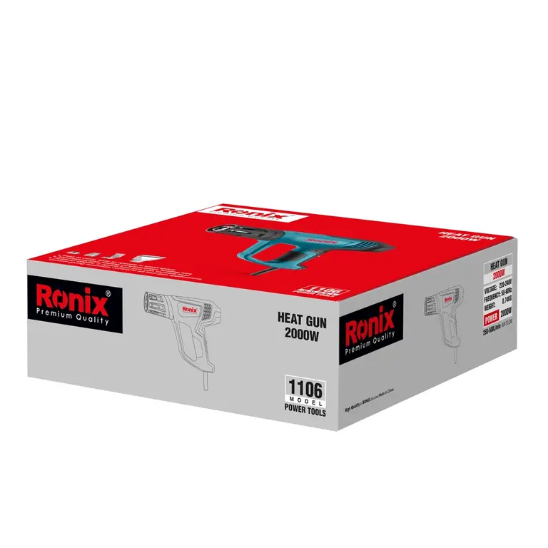 سشوار صنعتی برقی 2000 وات رونیکس مدل 1106 در جعبه رنگی رونیکس به همراه پوشش محافظ در برابر دمای بالا و سوختگی، نازل مخروطی، نازل دم ماهی، عدد نازل متمرکز کننده و عدد نازل محافظ شیشه به بازار ابزار ایران عرضه میشود.