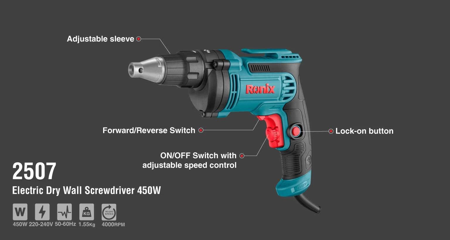 از پیچ گوشتی برقی برای بازکردن و بستن سریع تعداد زیاد پیچ در مصارف صنعتی، کارگاههای کابینتسازی و نجاری استفاده میشود. پیچ گوشتی 2507 رونیکس، برای انواع پیچکاری در دیوار خشک طراحی شده است.