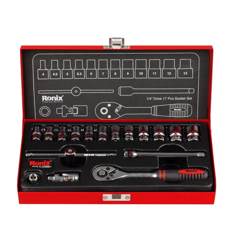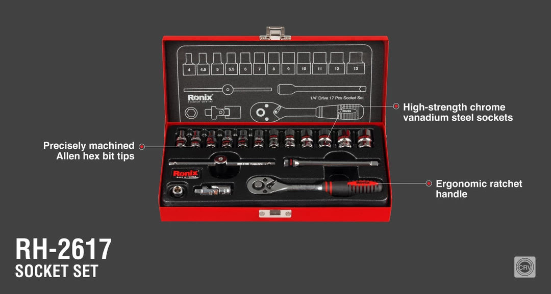 مجموعه بکس RH-2617 رونیکس متشکل از 17 قطعه متفاوت اعم از آچار، سری و دسته است که سایز درایو همگی آنها 1/4 اینچ است. قطعات این جعبه بکس عبارتند از: