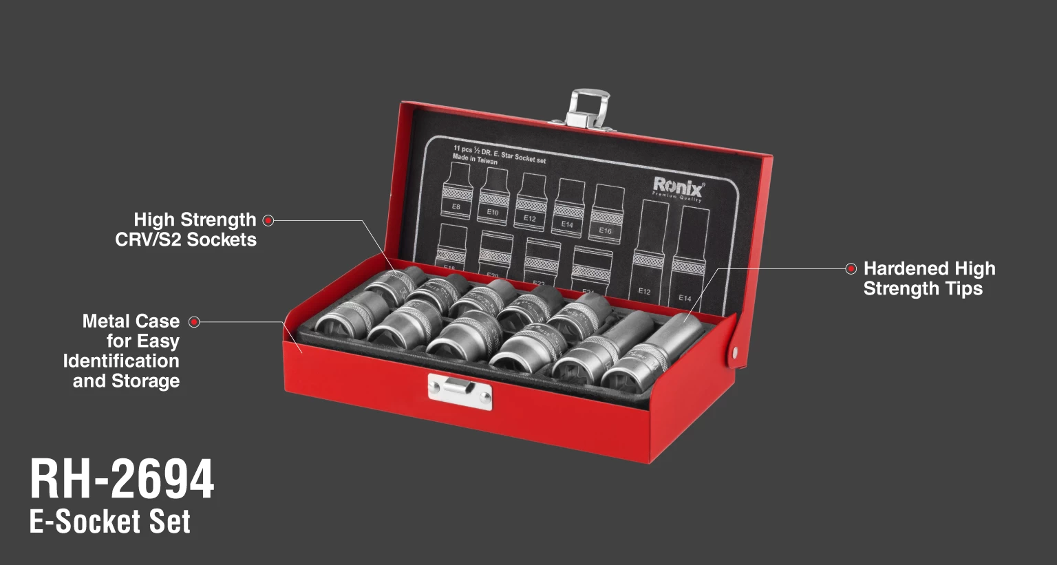 جعبه بکس RH-2694 شامل 9 عدد سری بکس ستارهای کوتاه و 2 عدد سری بکس ستارهای بلند با سایزهای متنوع است تا در کاربردهای مختلف بتوانید از آن استفاده کنید.