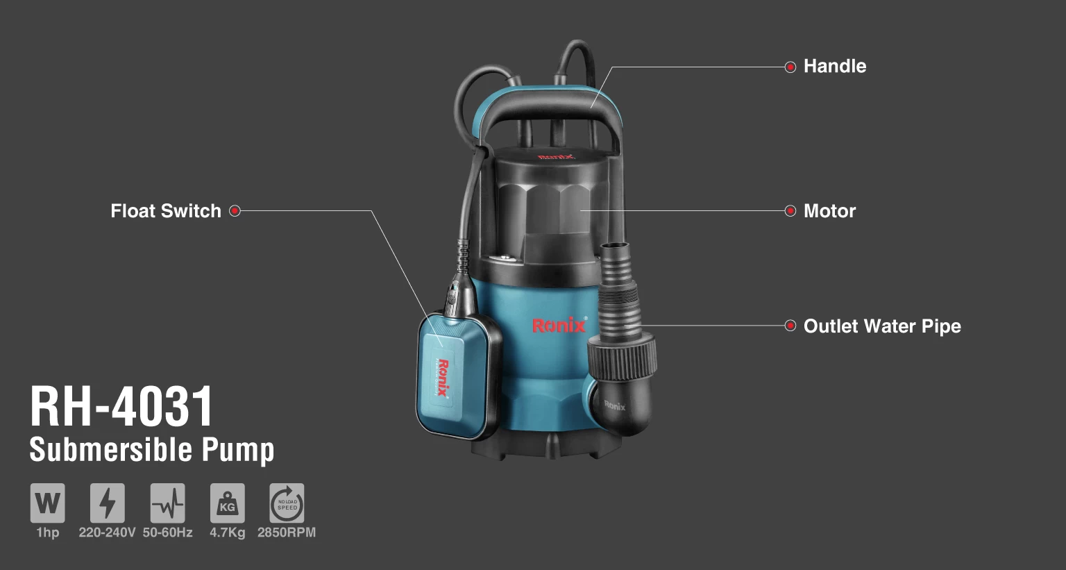 پمپهای کفکش کاملا در آب غوطهور میشوند و سپس آب را بالا کشیده و تخلیه میکنند. به همین دلیل به آنها پمپهای مستغرق، غرقابی یا شناور میگویند. در پمپ کفکش مستغرق RH-4031 رونیکس، موتور الکتریکی دستگاه، پمپ را به حرکت در میآورد و با افزایش انرژی جنبشی سیال، آن را پمپاژ میکند. فشار سیال خروجی با چرخش پروانه تنظیم میشود.