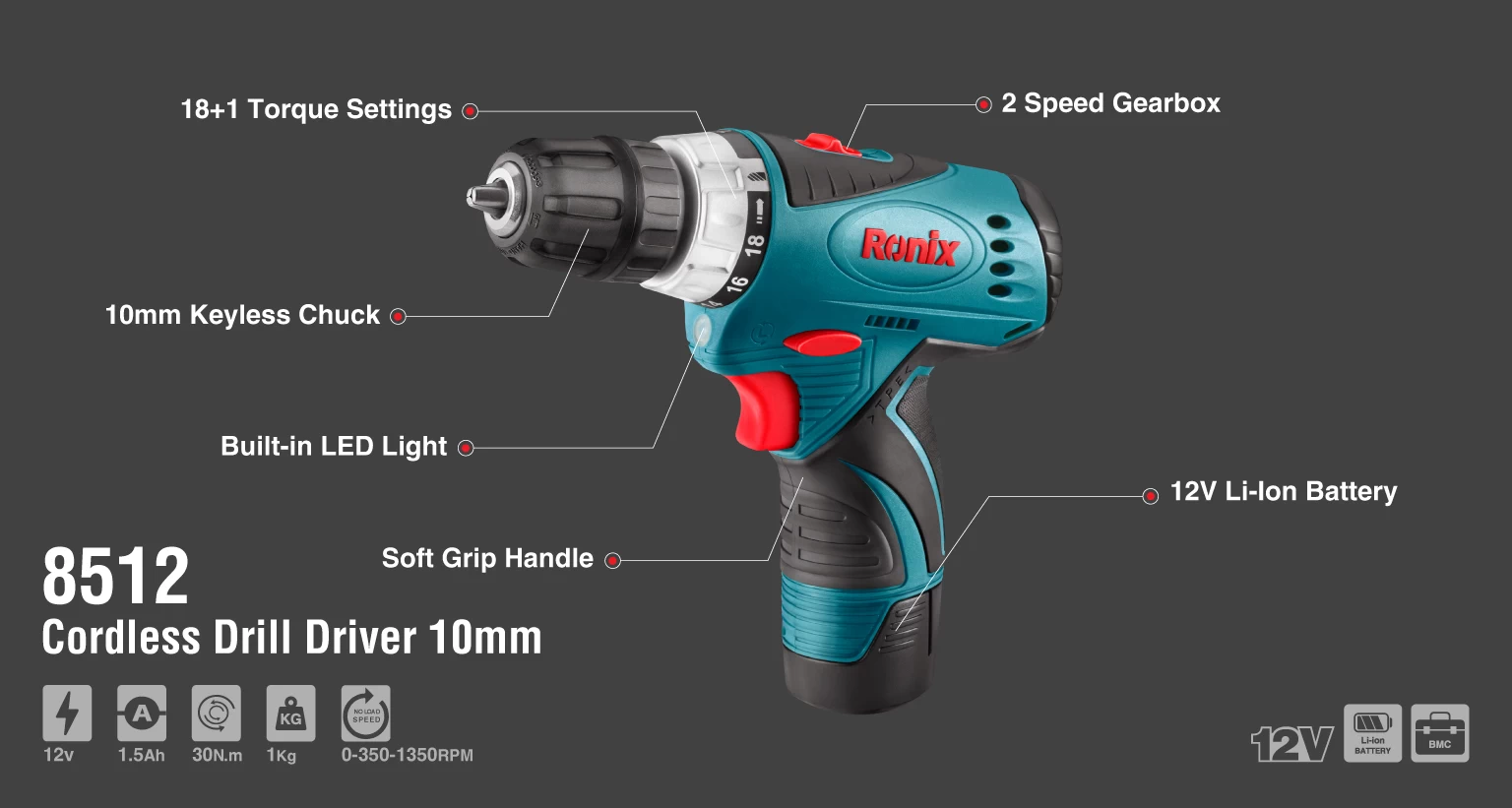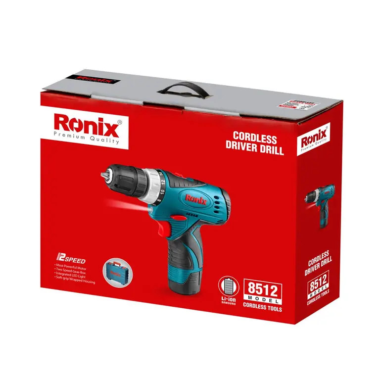+ دریل پیچ گوشتی شارژی 8512 رونیکس: موتور گیربکسی قدرتمند؛ سهنظام دوتکه اتوماتیک؛ باتری بادوام