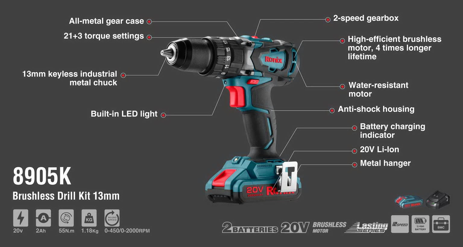 کیت دریل پیچ گوشتی چکشی شارژی 13 میلیمتری رونیکس مدل 8905K پیشنهاد ما به شما است؛ ابزاری کوچک و کموزن در سری تاپ لاین رونیکس که همزمان، قابلیت دو محصول را به شما ارائه میدهد. محصولی که در نقاط غیر قابل دسترس یا در شرایط بدون برق شهری، همراه شما بوده و فعالیت شما را متوقف نمیکند.