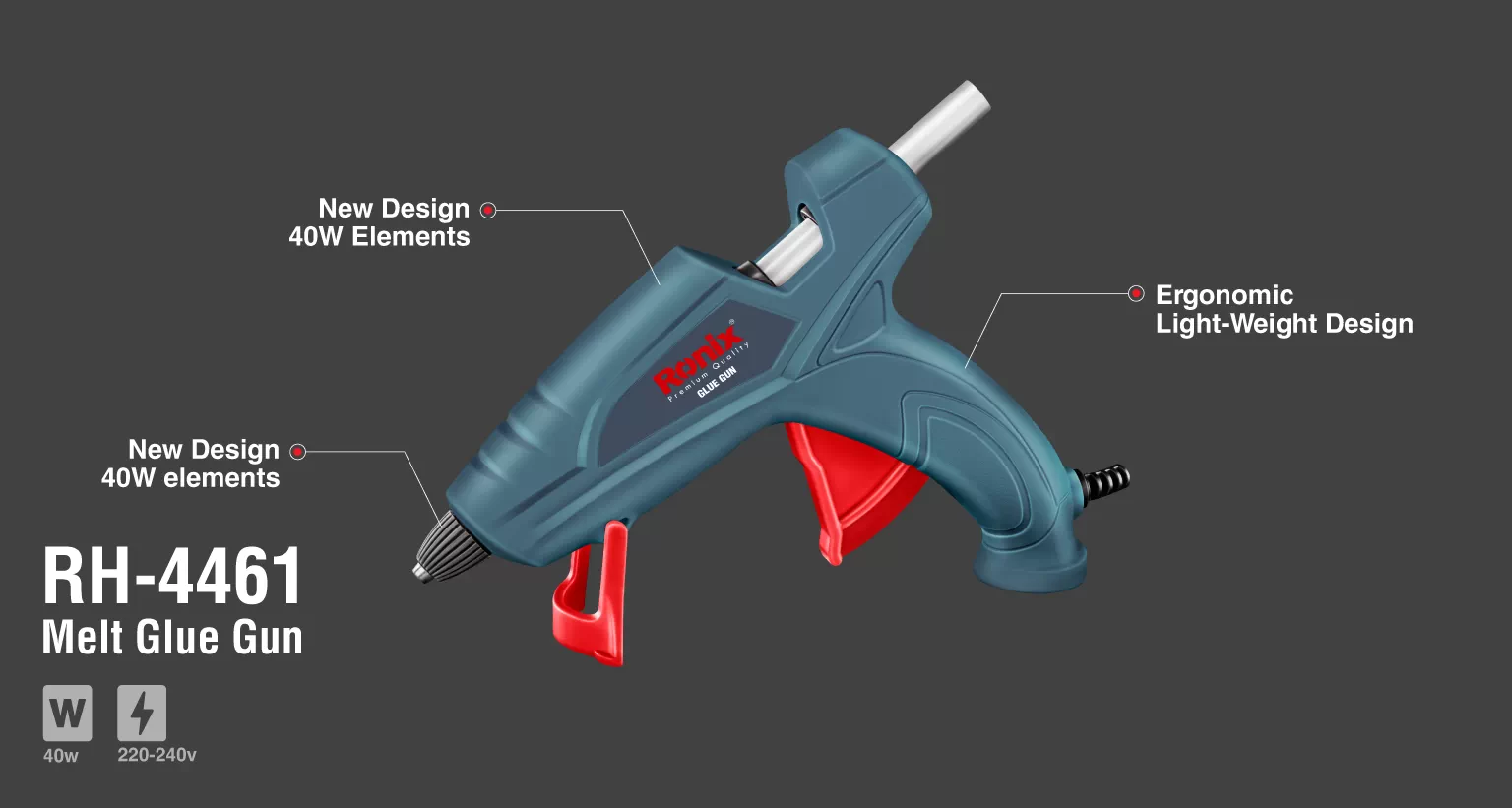 تفنگ چسب حرارتی رونیکس با توان 40 واتی خود قادر است تا در هر دقیقه به میزان 12 تا 16 گرم چسب را ذوب کرده و بر سطح کار تزریق کند.