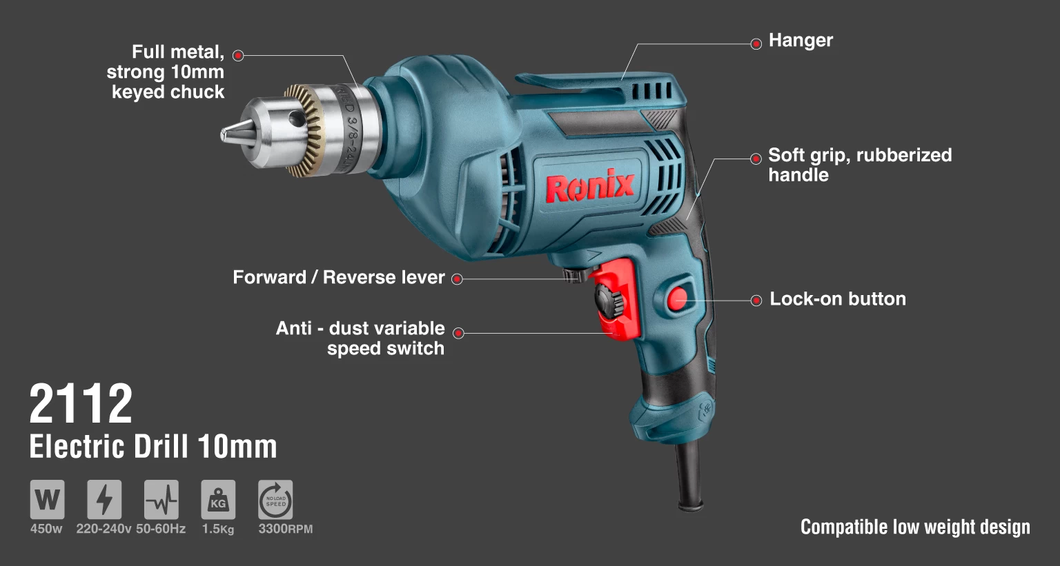 دریل برقی 2112 رونیکس، مجهز به موتور پرقدرت و بادوام 450 وات و متشکل از آرمیچر و بالشتکهای صنعتی با کیفیت ساخت فوقالعاده بالا است. سرعت گردش این دریل در حالت آزاد، در محدودهی صفر تا 3300 دور در دقیقه است و سوراخکاری و بستن پیچ را در چوب و فلزات امکانپذیر میکند.