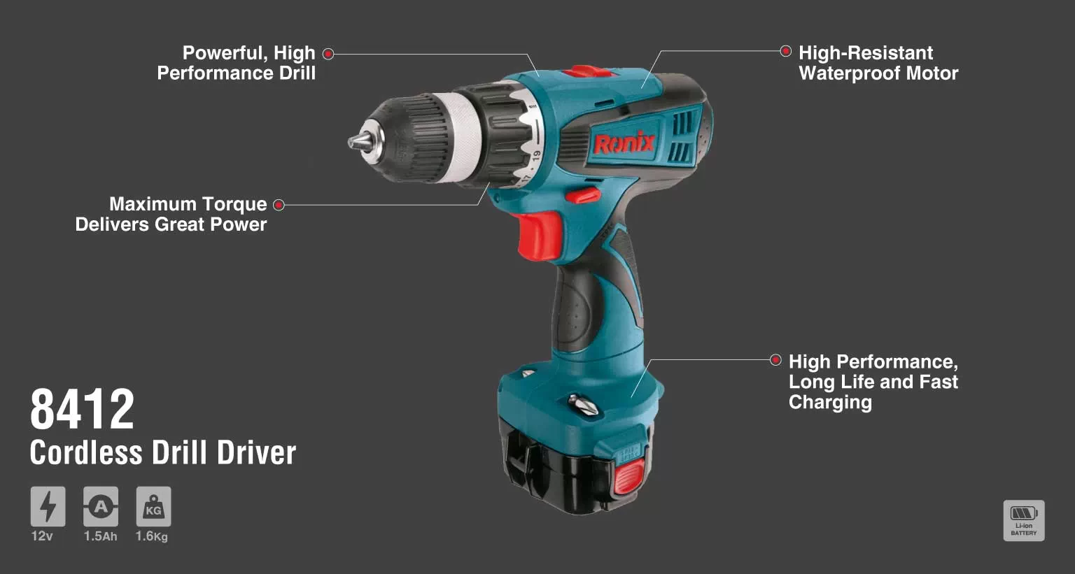 دارای کیف BMC مقاوم در برابر ضربه دارای چراغ LED جهت کار در محیط های تاریک و کم نور دریل پیچ گوشتی شارژی 12 ولت صنعتی موتور پر قدرت صنعتی استفاده از سیستم خنک کننده (Fan Cooled) موتور جهت کم کردن استهلاک و طول عمر بیشتر دستگاه مجهز به گیربکس دو دور جهت افزایش اثر بخشی حین کارکرد حین پیچ کاری و سوراخکاری در صنایع مختلف